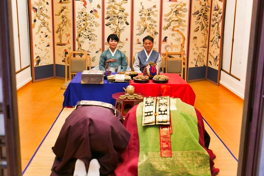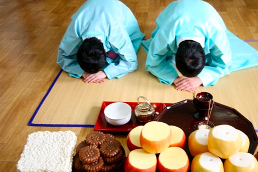 韓國日常生活中常見行大禮的部分,便是家庭每逢重要節日時的祭祀(祭祖),家人們會齊聚一堂,準備豐盛的食物,向仙逝的長者、祖先表達感恩之意,子女們也得依序於先人牌位前行大禮。