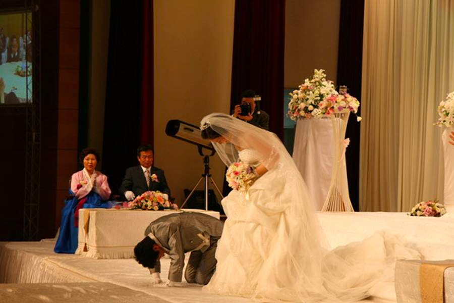 而在韓國婚禮中,也會有行大禮的環節,主要常見於傳統韓式婚禮,夫妻向父母行大禮的場面;而在西式婚禮中雖不常見,但也會有新郎向女方父母行大禮,或是對來賓致上感謝之意的跪拜大禮。