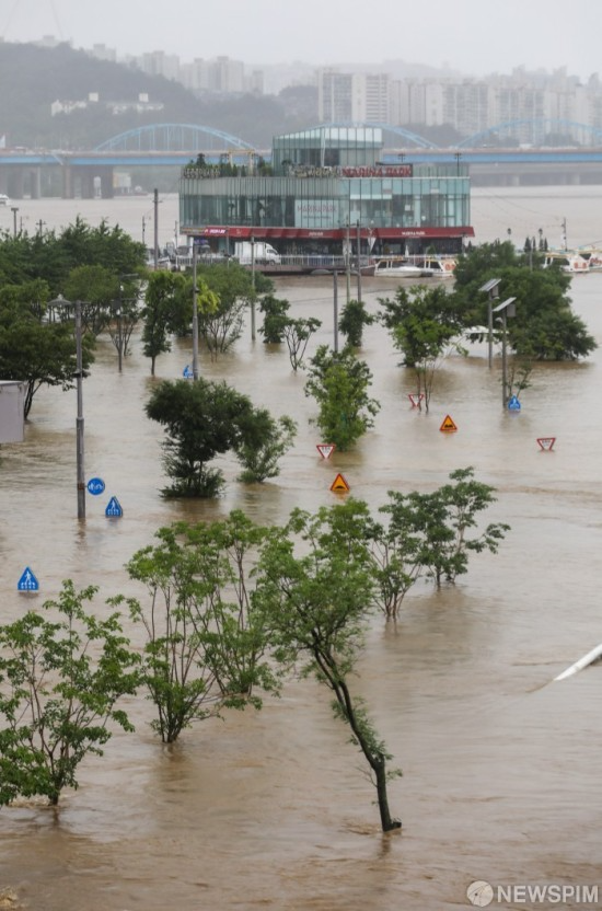 9日上午被水淹沒的盤浦公園(來源:뉴스핌)