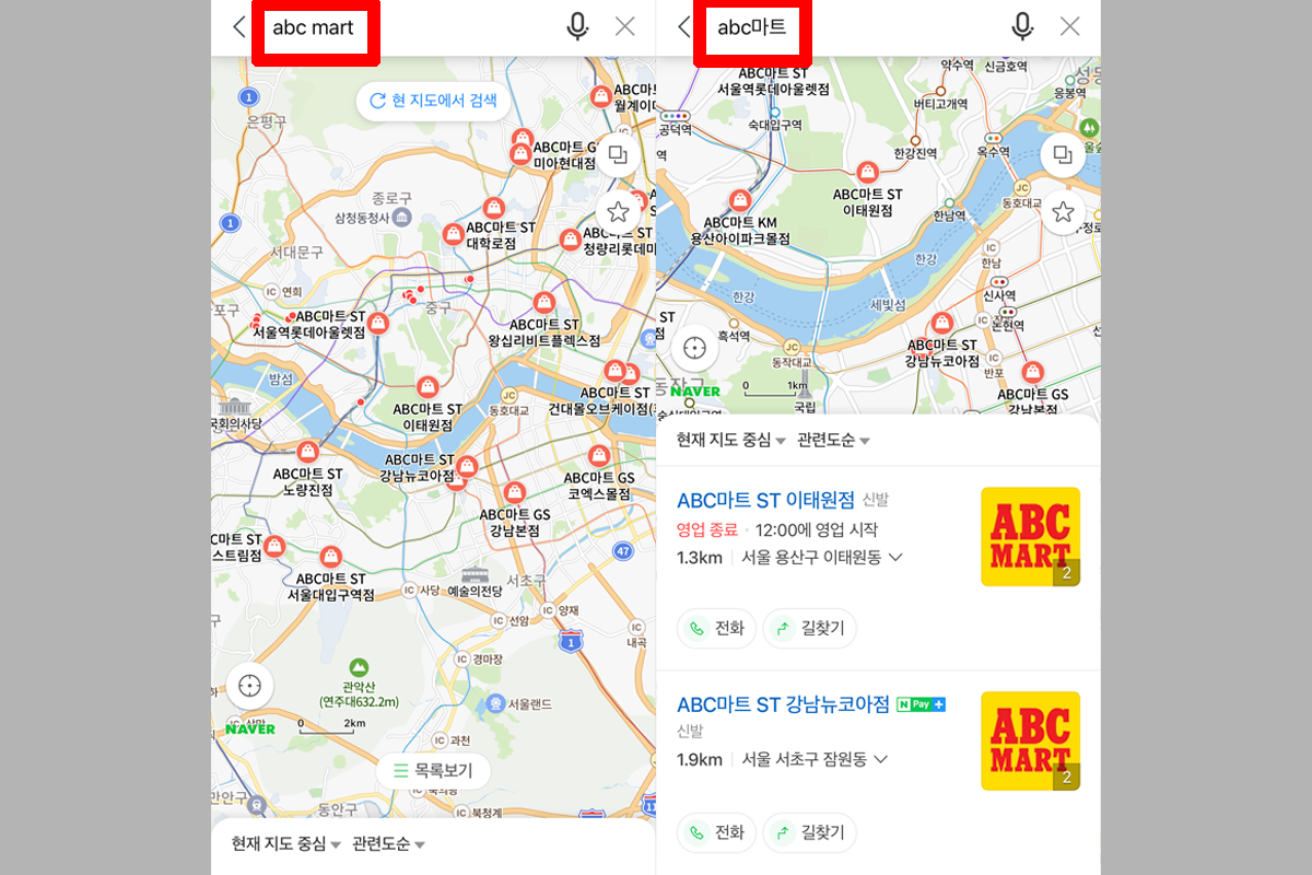 主要以英文搜尋「ABC Mart」或者複製貼上韓文「ABC마트」,就能看到搜尋結果,非常方便。