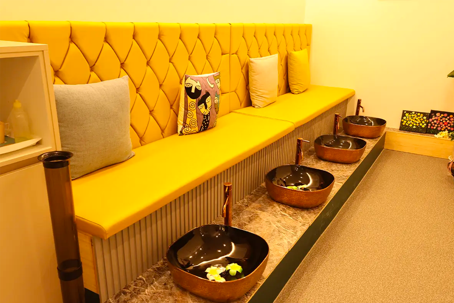 首先換完衣服後,旁邊有一個足浴室,一進來就會感受到濃郁的檸檬草精油香氣,這種精油可以讓身心更加放鬆、安心舒適。泡腳浴的同時,還能品嚐熱茶來緩解旅行中腿部累積的疲勞。