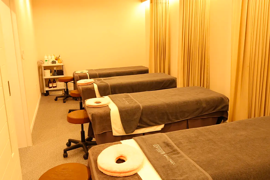 這裡是多人共用的空間,但有窗簾隔開每張床,讓顧客有更好的隱私。此外,提供的被子有一點點厚,是為了讓客人在按摩時感受溫暖,增加整體按摩的效果。