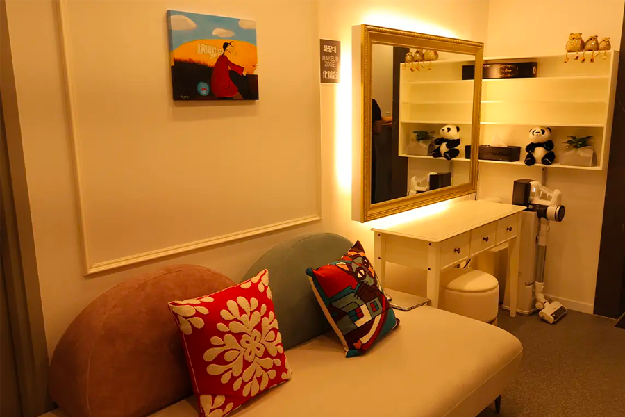 店裡的中央位置放置了一個梳妝檯和各種護理用品,提供顧客使用,按摩完後也能在這整理儀容。