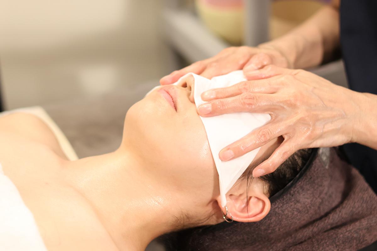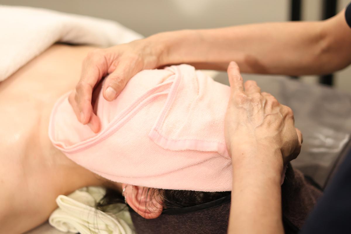 接下來,就是擦掉沒有完全滲透的精華,並用熱毛巾放鬆脖子、斜方肌與肩膀。
