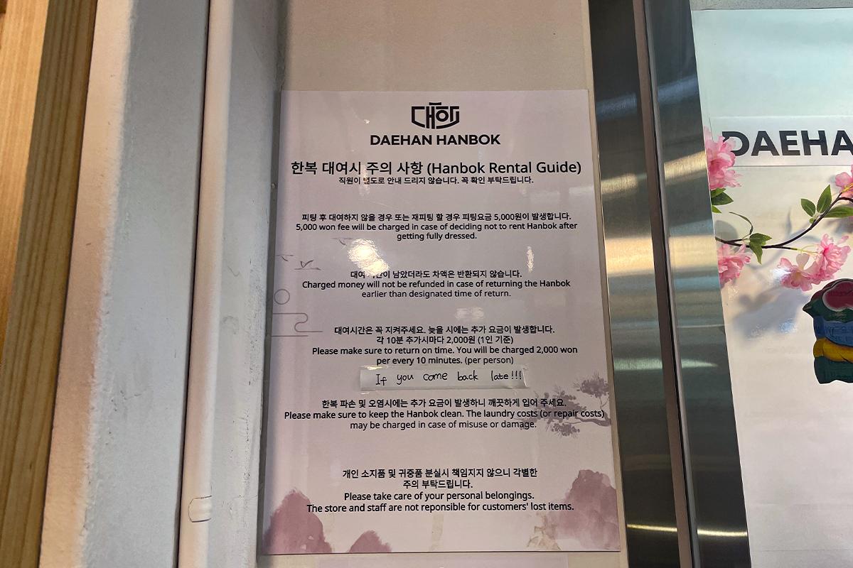 這裡還有以中文、日文、英文標注的韓服注意事項,建議租借前後,可以再三確認。