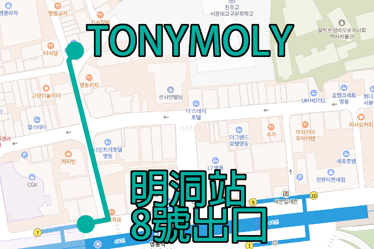 - 小撇步:首爾地鐵4號線明洞站(명동역)8號出口出來後直走,於第一個路口處左轉,經過兩個十字路口,右前方就會看到TONYMOLY(詳細路線圖參考文末)。
