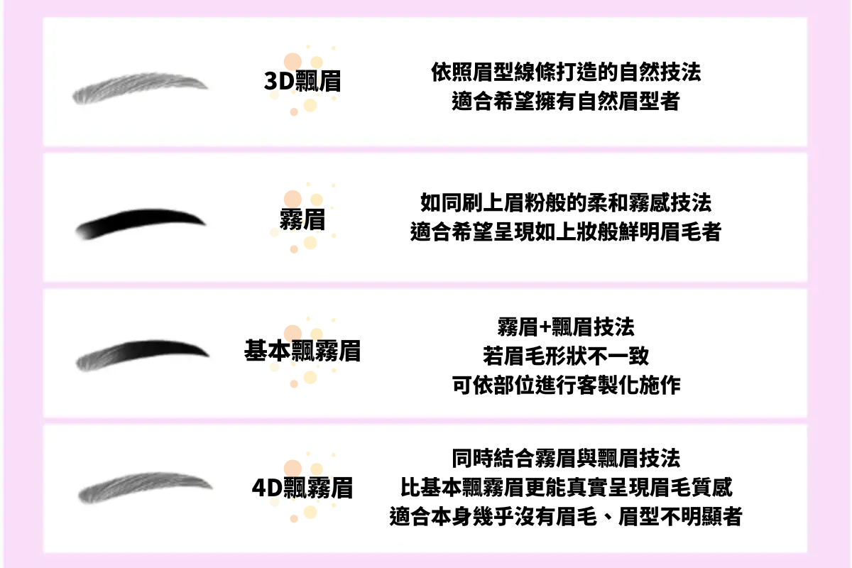 包括依照眉型線條打造自然感的3D飄眉、呈現如妝感般鮮明眉毛的霧眉(妝感眉)、結合3D飄眉與霧眉的基本飄霧眉,以及即使眉毛較少也能打造逼真眉型的4D飄霧眉。