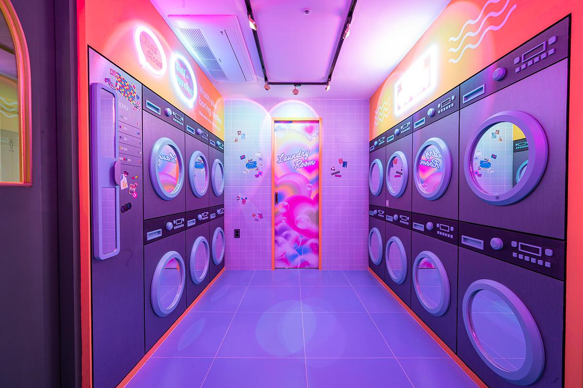 洗衣房裡有排列整齊的有洗衣機,每台洗衣機的門都是由鏡子製成,不僅增加了空間的明亮感,還讓整個房間充滿了現代感。