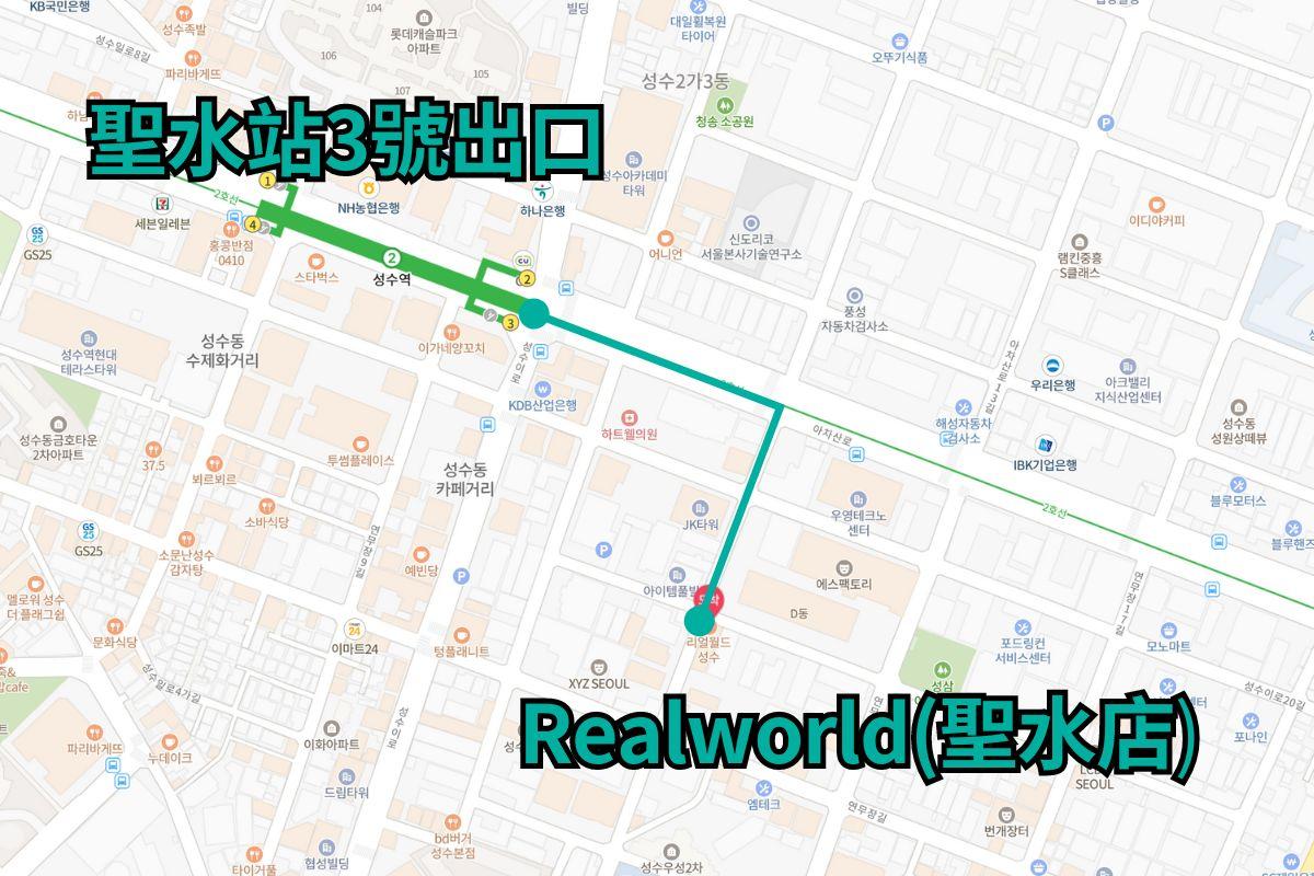 - 小撇步:首爾地鐵2號線聖水站(성수역)3號出口出來後直走,第三個路口右轉直走約150公尺,抵達Realworld(聖水店)(詳細路線圖參考文末)。