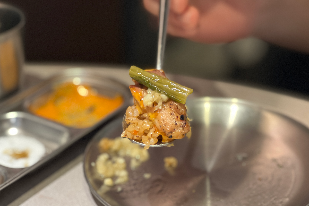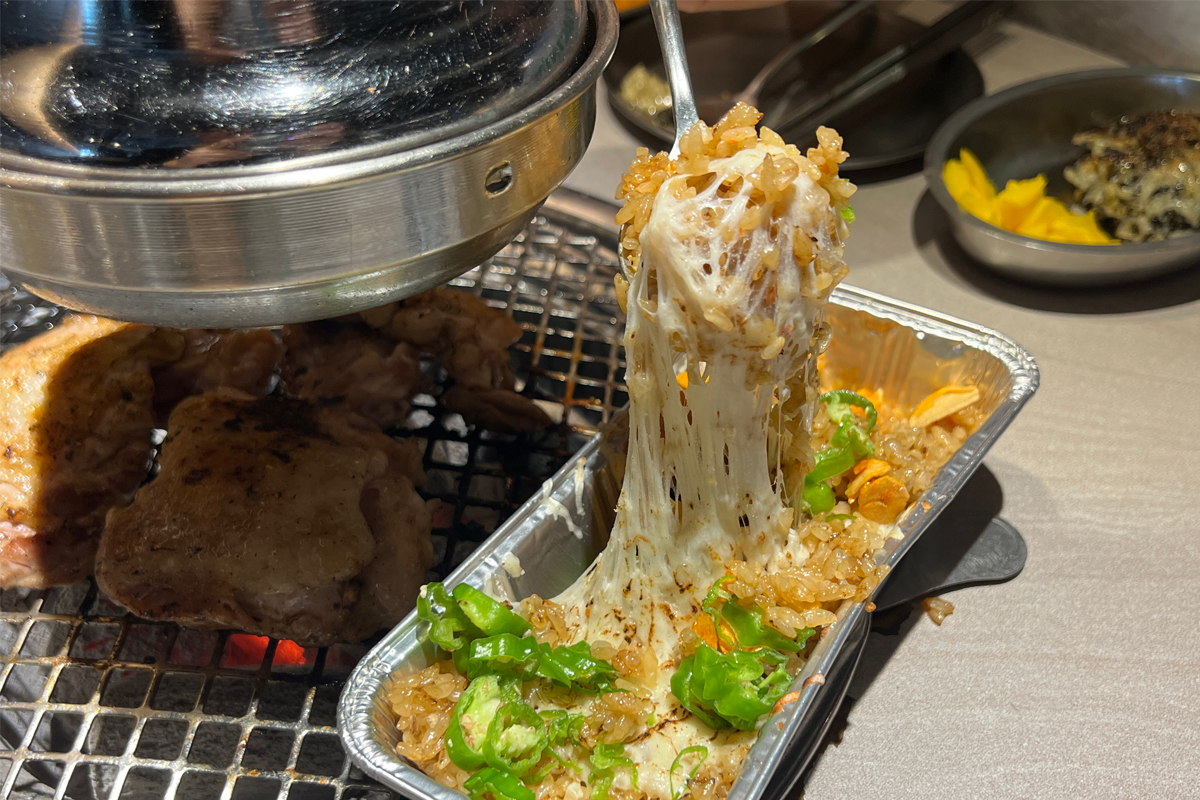 如果剛剛還吃不夠,小編推薦可以點蒜香炒飯,會以這樣一盒形式上桌,放在鐵盤上繼續加熱,起司融化之後再攪拌,每一口都是蒜香與起司的濃郁結合。