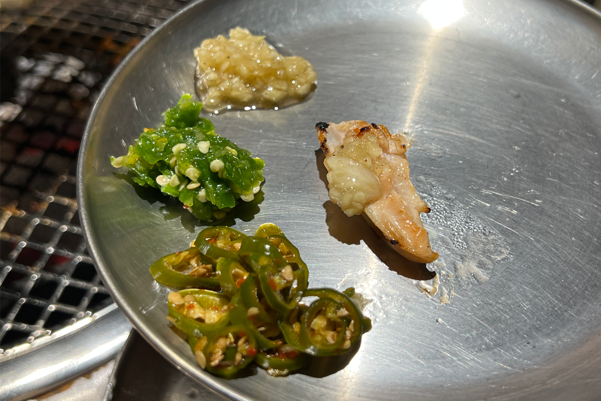各位也可以試著沾沾看店家的基本配料,從左而右分別是香油、鹽巴與類似柑橘醬的甜鹹醬料,最右邊的配上烤肉有種解膩的清新感。