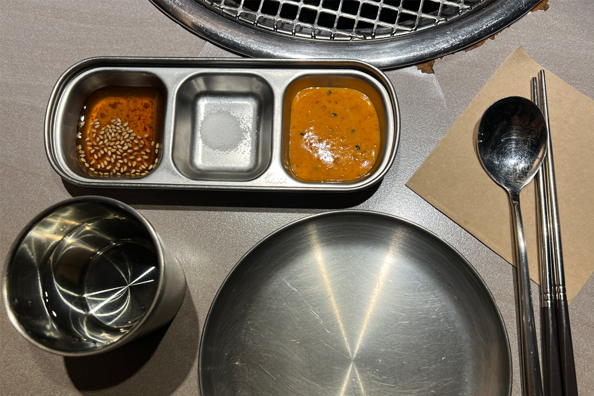 當兩面烤到帶有微微的焦糖色,店員就會協助把烤好的肉放到鐵盤周圍保溫,這時就能沾上醬料一起吃。