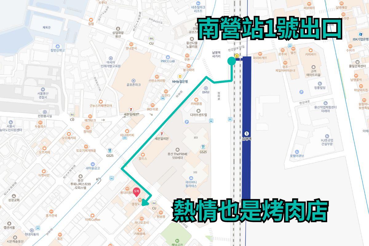 - 小撇步:首爾地鐵1號線南營站(남영역)1號出口出來後直走左轉,直走右轉過人行道後左轉,直走經過兩個斑馬線左轉,直走第一個巷口右轉,右前方即可抵達熱情也是烤肉店。