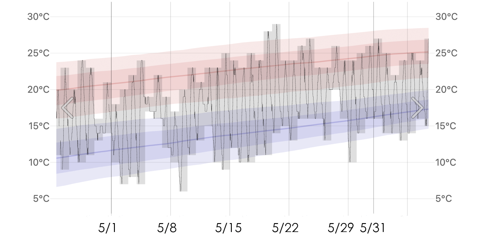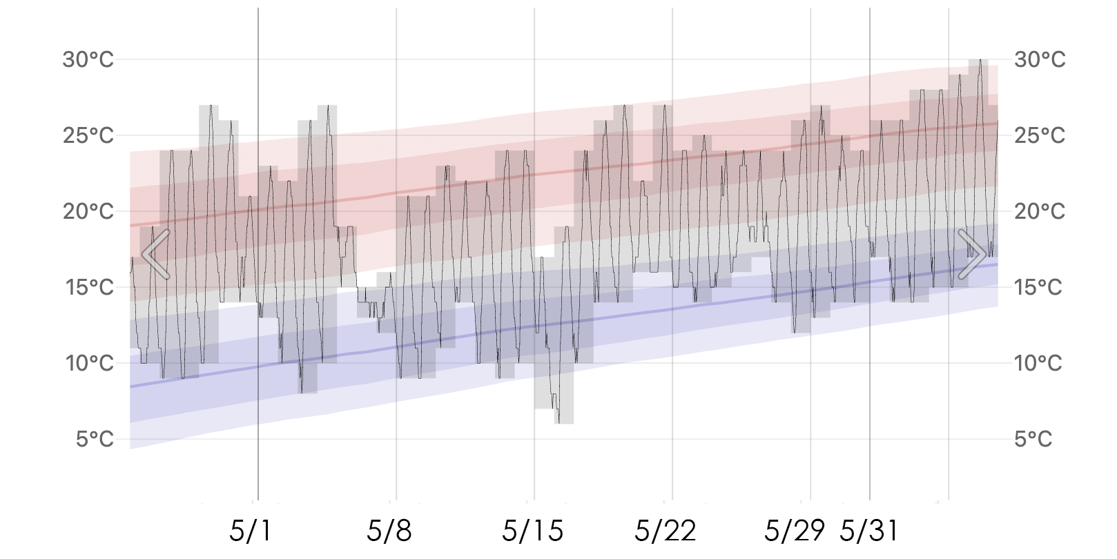 到05月下旬,最高溫跟最低溫的差距也會越來越小,白天甚至有點熱,最高溫30度幾乎是夏天了呢。