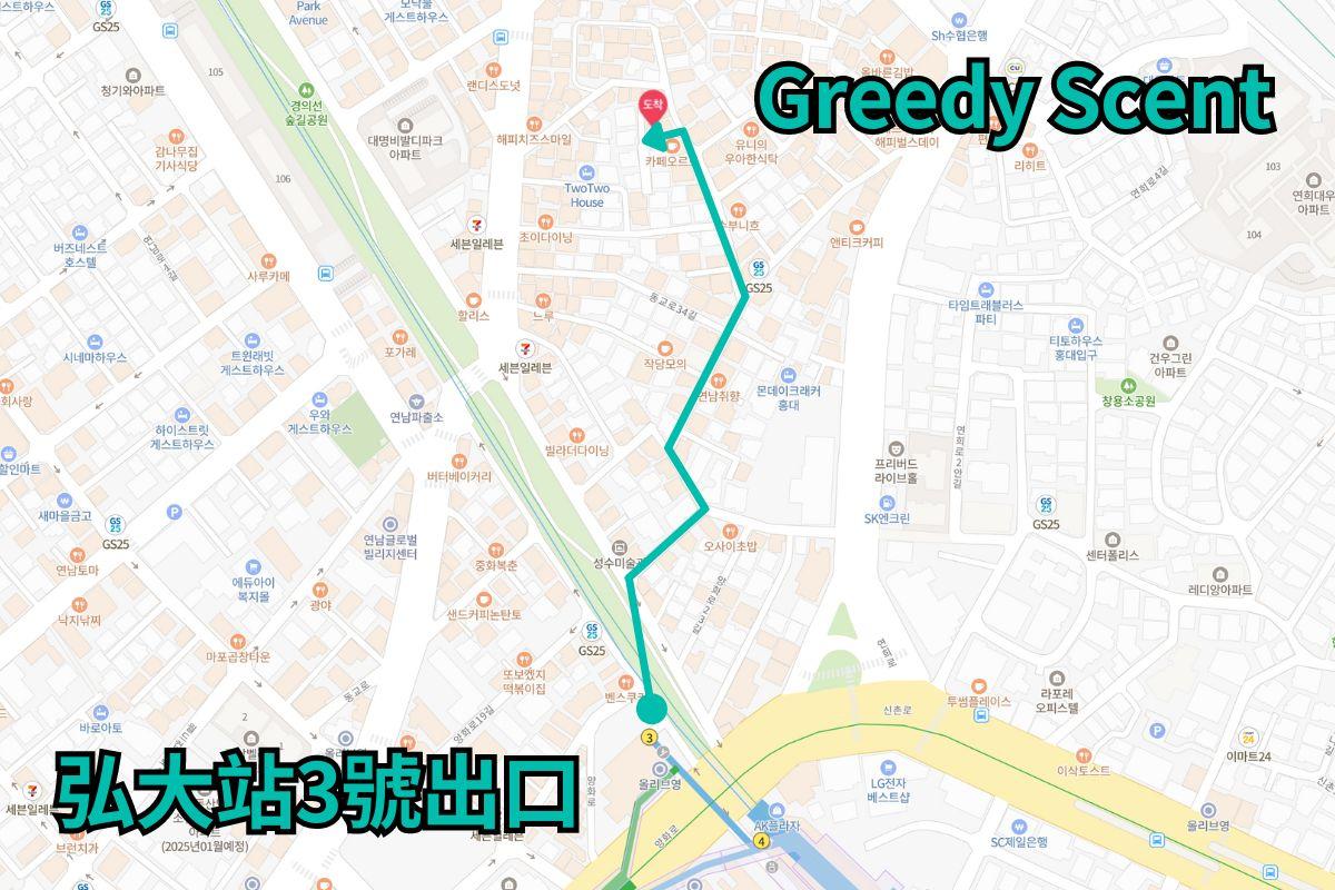 - 小撇步:首爾地鐵2號線弘大站(홍대역)3號出口出來,走路約7分鐘即可抵達Greedy Scent。