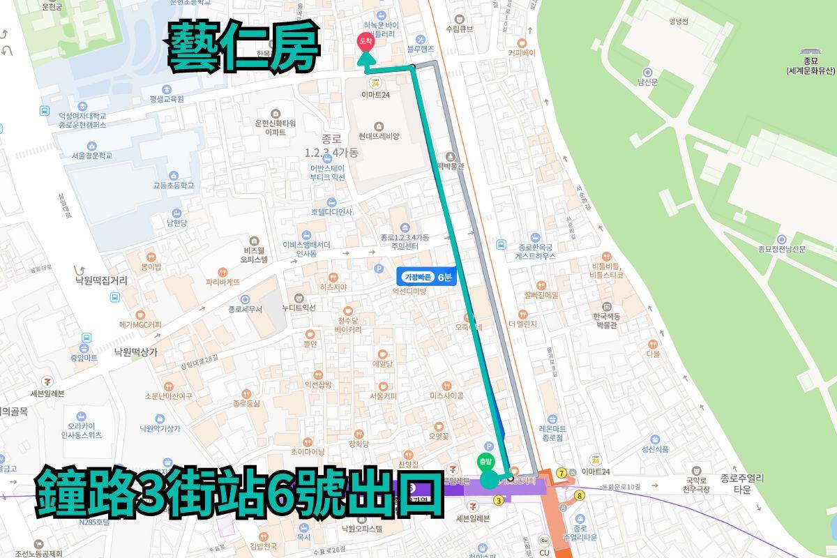 - 小撇步:首爾地鐵1、3、5號線鐘路三街站(종로3가역)6號出口出來後走6分鐘,即可抵達藝仁房。