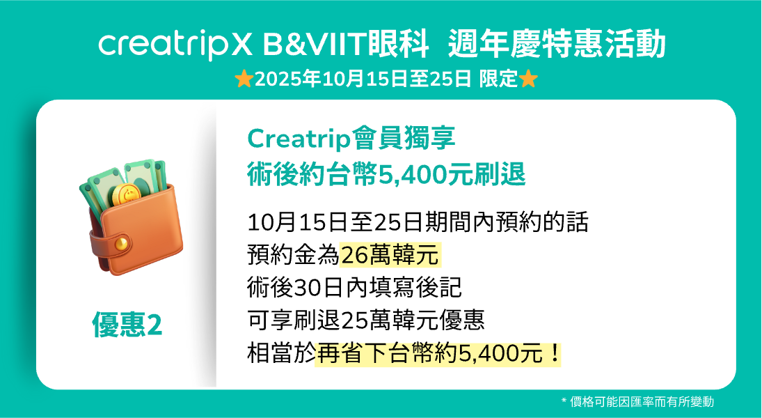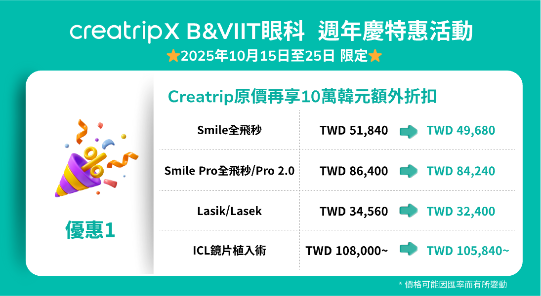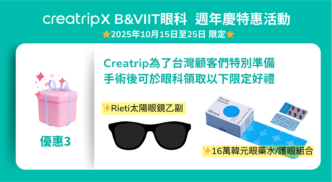 - 優惠:週年慶期間預約B&VIIT眼科視力矯正施術享獨家折扣