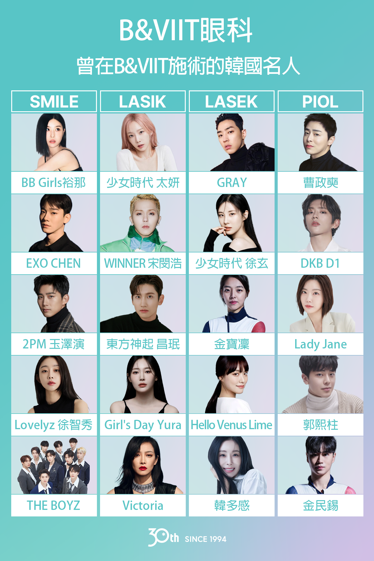 B&VIIT眼科也是許多韓國藝人進行視力矯正手術的診所,從少女時代、EXO、2PM、東方神起、Girl's Day、THE BOYZ等眾多明星,都在這裡接受手術,說明了B&VIIT眼科的值得信賴。