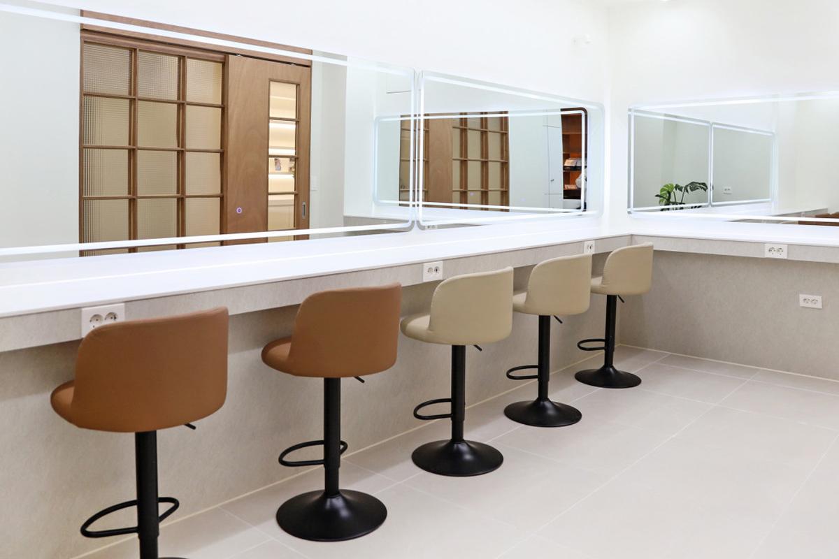 一進到教室,各色彩妝盤讓人眼花繚亂,視覺上非常享受;牆面全是鏡子,方便隨時查看自己的樣子。