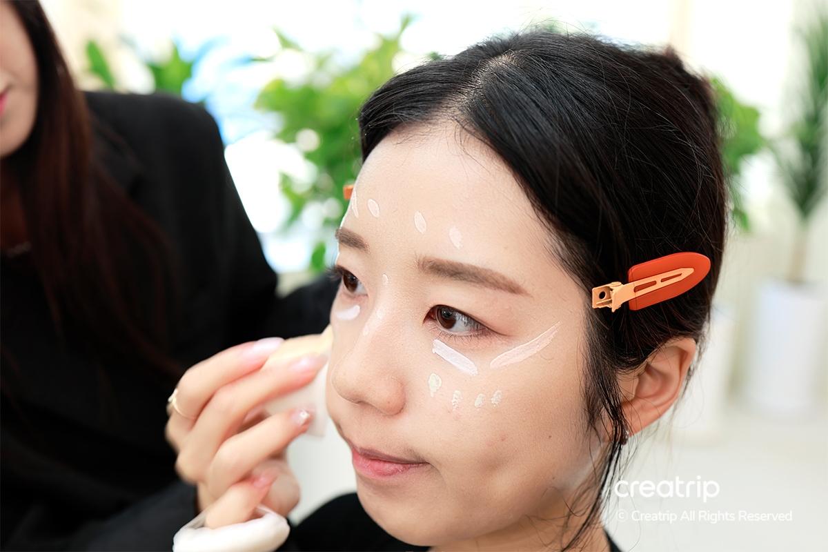 底妝部分,首先使用刷子將粉底均勻塗抹開來,然後用粉撲仔細推開,讓底妝緊貼肌膚,打造出自然的肌理感。
