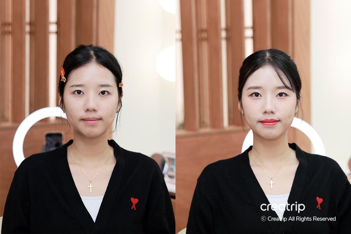和一開始的樣子真的差很多吧?這次在Beauty Palace完成了非常適合韓服的珊瑚色系可愛妝容,也順道做了適合韓服的髮型,化妝師還大方地加入了珍珠飾品,讓整體造型更加華麗。