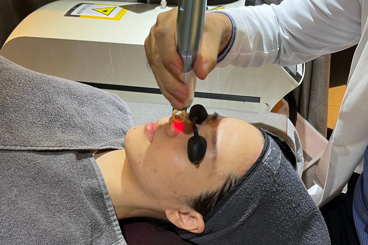 接著馬上進行「雷射除痘」,利用雷射去除之前因為痘痘而留下的痘印。施術前,醫生都會先在自己手上測試能量,不會有能量過強導致反黑或過於疼痛的情形發生。