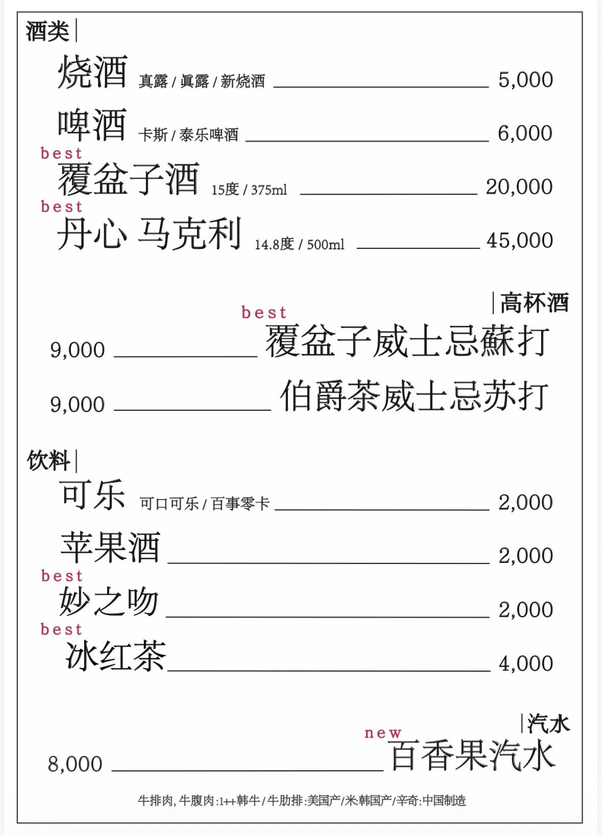| 韓牛肋眼肉 (100g) | ₩37,000 | |