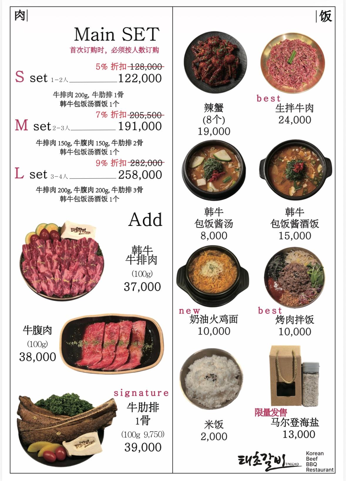 | Beef SET(肋眼肉+特大排骨) 首次點餐需先點套餐 | S套餐 | ₩122,000 (122000) |