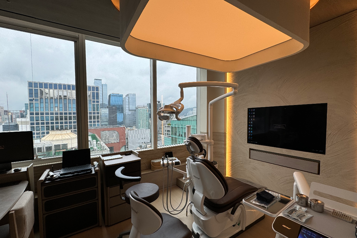 單人VIP診療室同樣令人驚豔,每位客戶皆安排於獨立空間,隔音與隱私都相當到位,且診療椅面對落地窗,可直接俯瞰江南街景,無論白天或夜晚,都有種「在空中做牙齒美容」的特別感受。