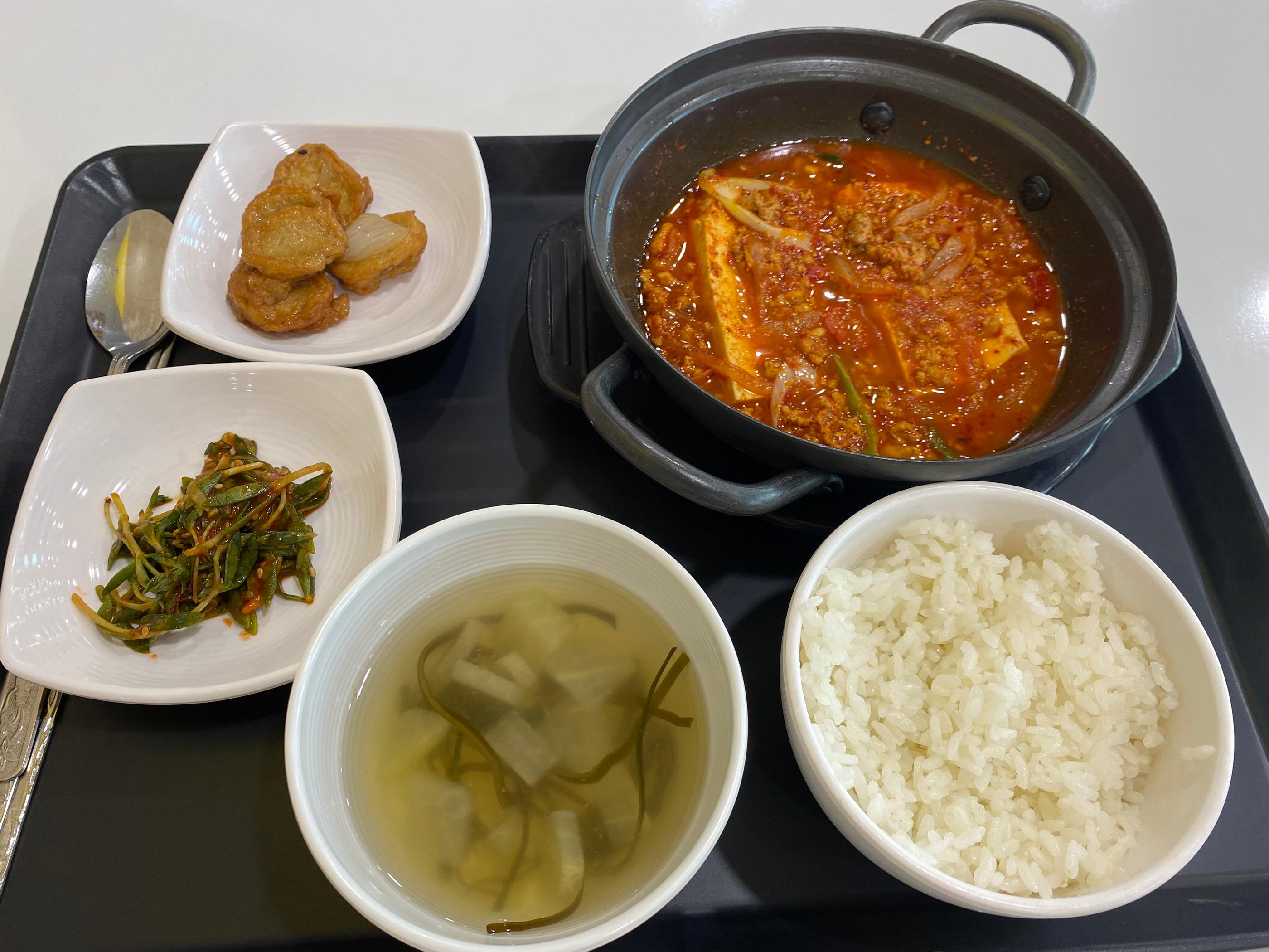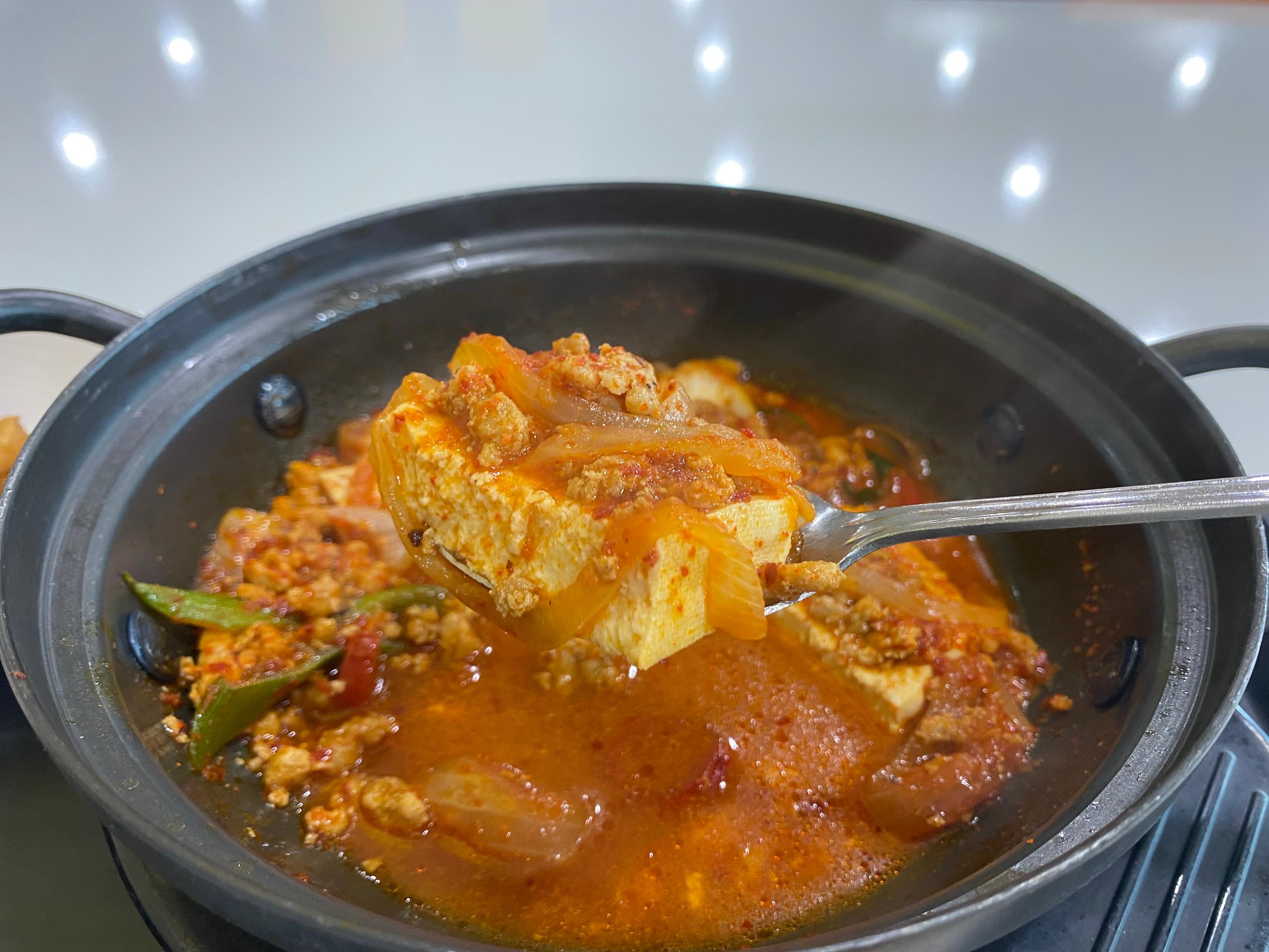 今天的辣炒豆腐湯裡有豬絞肉、豆腐、蔥和洋蔥等蔬菜。看起來紅紅的,但其實辣度適中,非常下飯!
