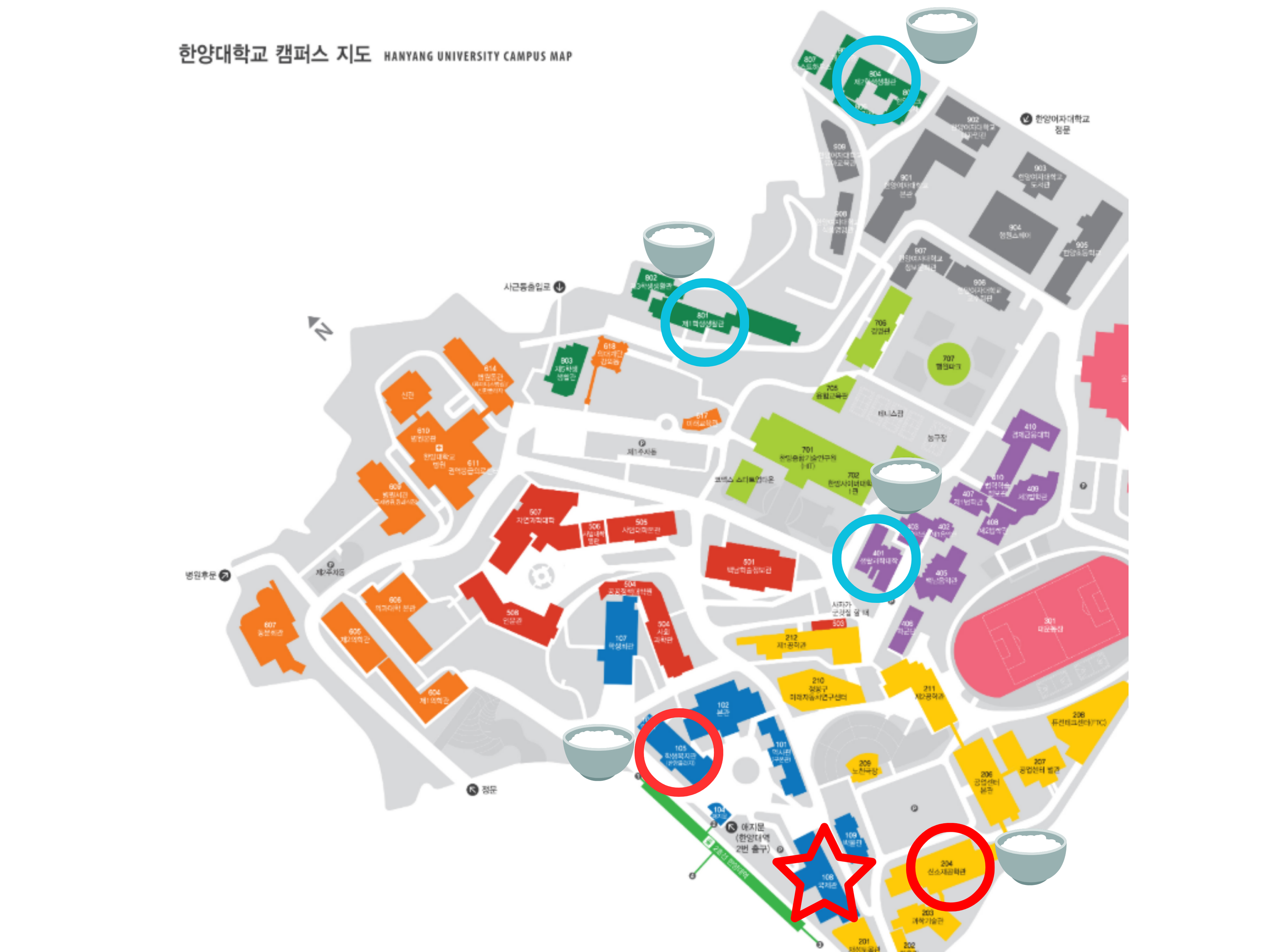 這次要介紹的是靠近語學堂的國際館附近的兩間學生餐廳(紅色圓圈標示處),Hanyang Plaza和新材料工學館!