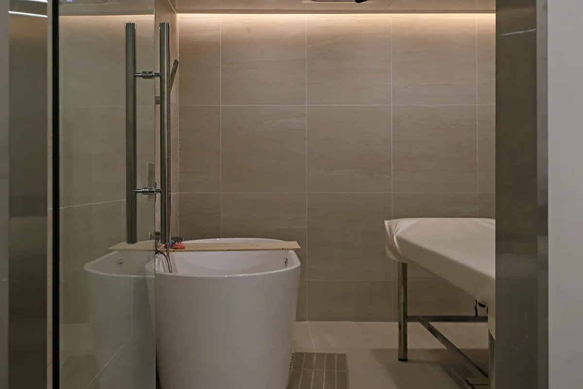 通常都會有專屬淋浴間和浴缸,讓各位先用溫熱的水好好暖身,這個步驟非常重要,因為能打開毛孔,讓後續角質更容易去除,整體磨砂效果也會更明顯、更加分。