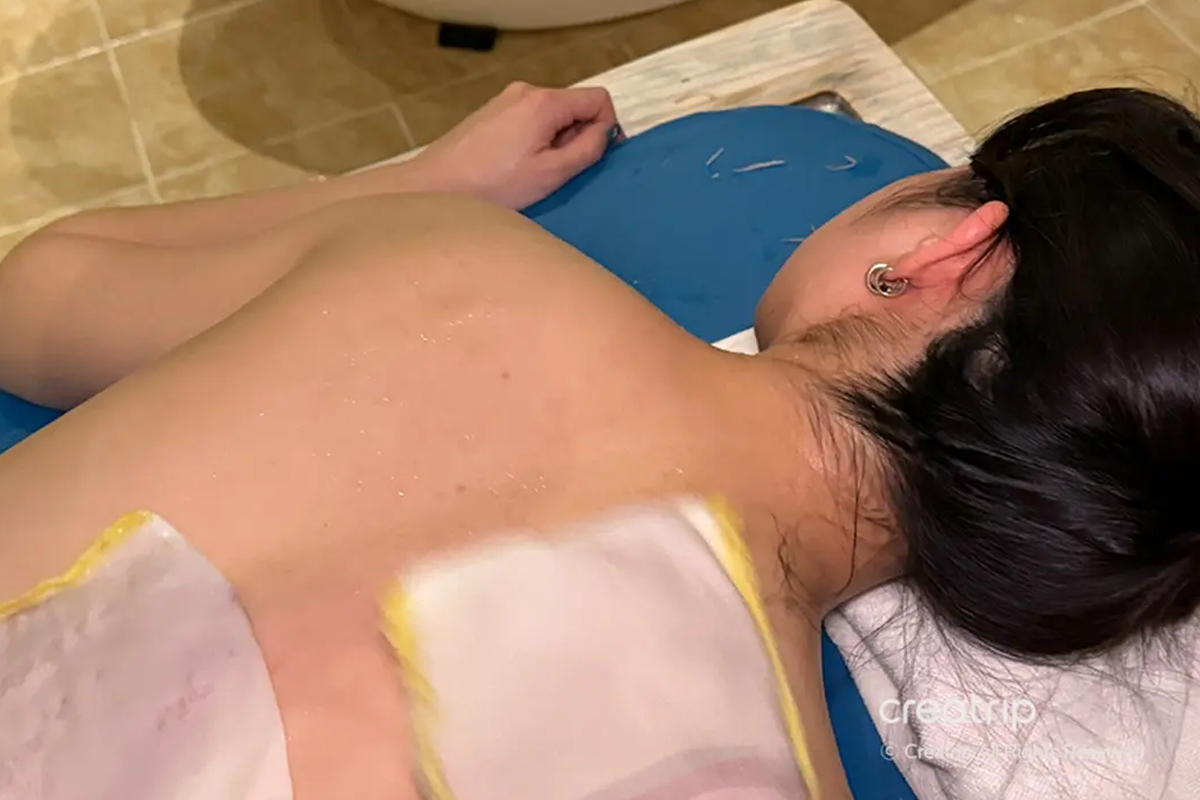 接著,美容師會使用專門的去角質手套或毛巾,仔細地幫你全身清潔,溫和地去除老廢角質和髒污。