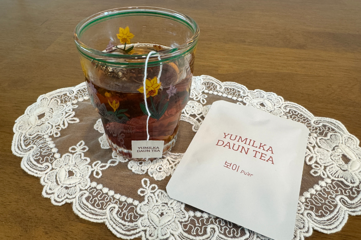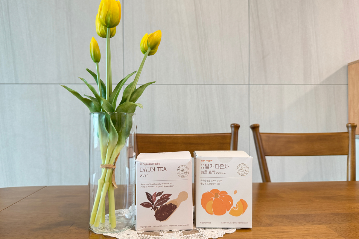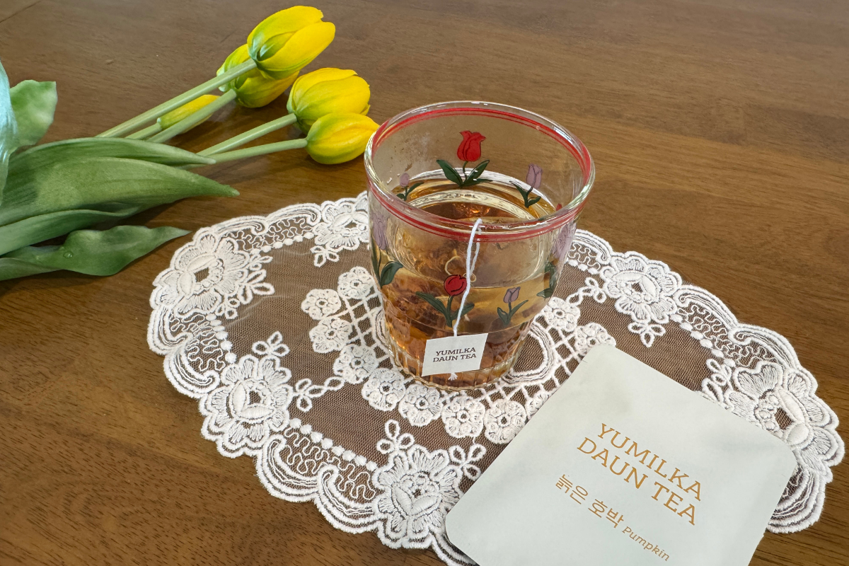 YUMILKA的「消腫茶」目前有兩種口味:幫助去水腫的「老南瓜茶(호박차)」和調節血糖的「普洱茶(보이차)」,不論你是需要早上暖胃醒腦,還是餐後來點不刺激的溫和茶飲,都能找到對味的選擇。