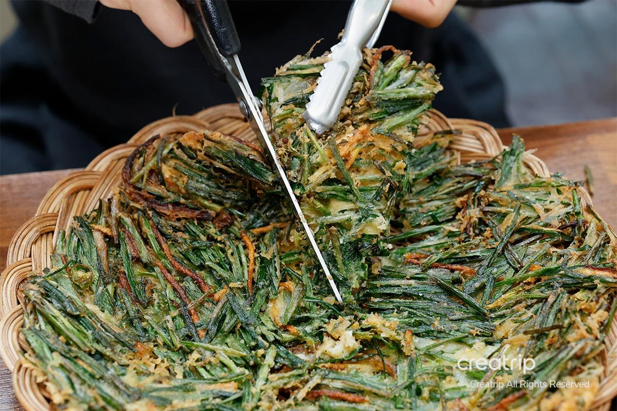 切成適合食用的大小,蘸上韭菜餅專用醬油,醬油的鹹味和韭菜的鮮味相得益彰,鮮美可口。
