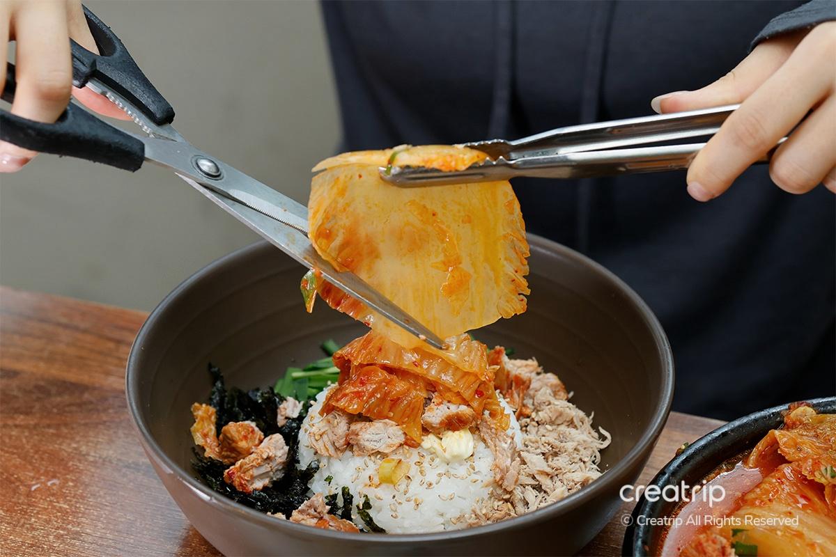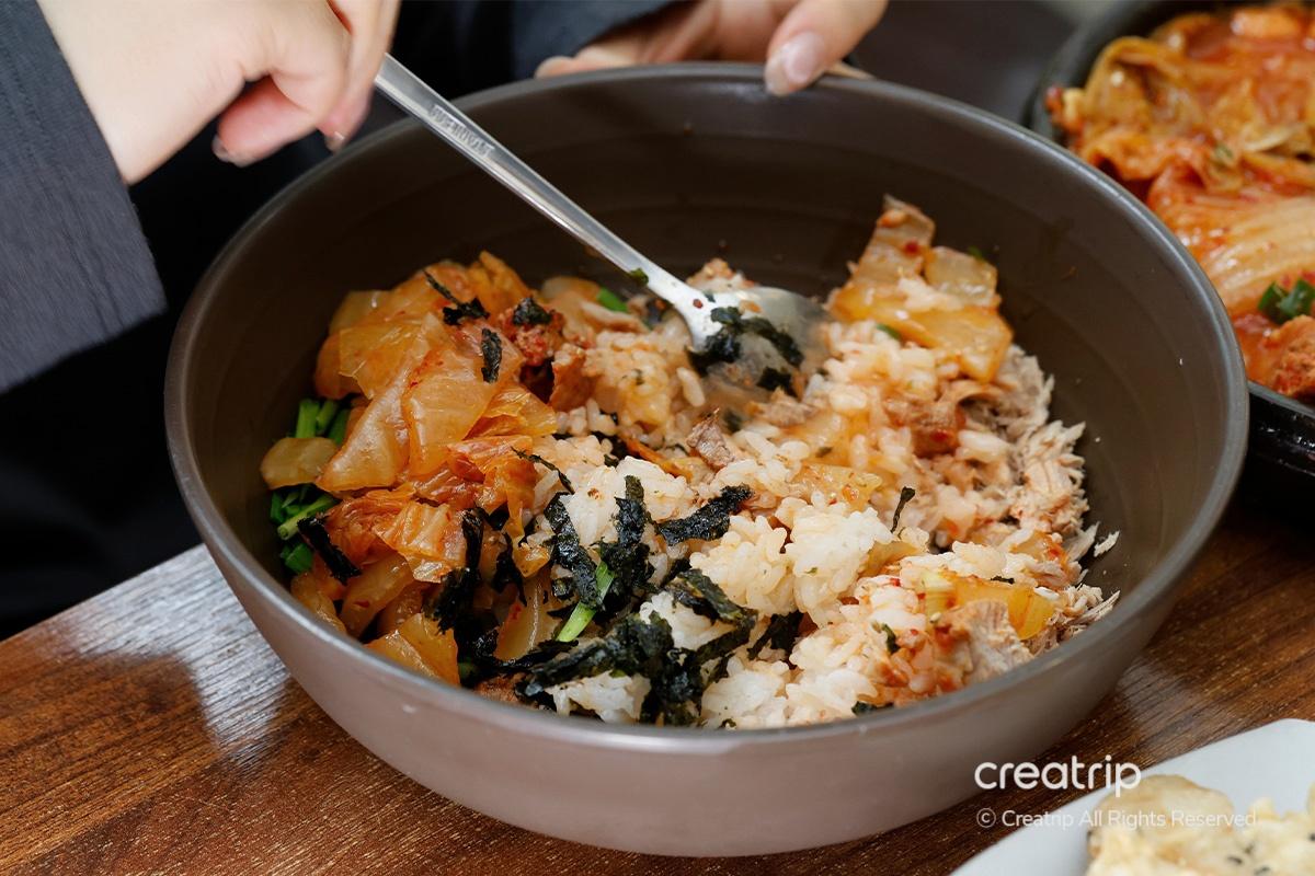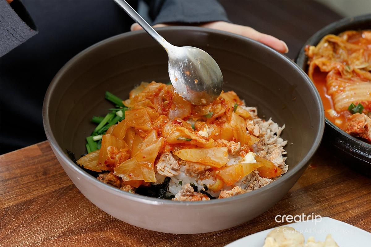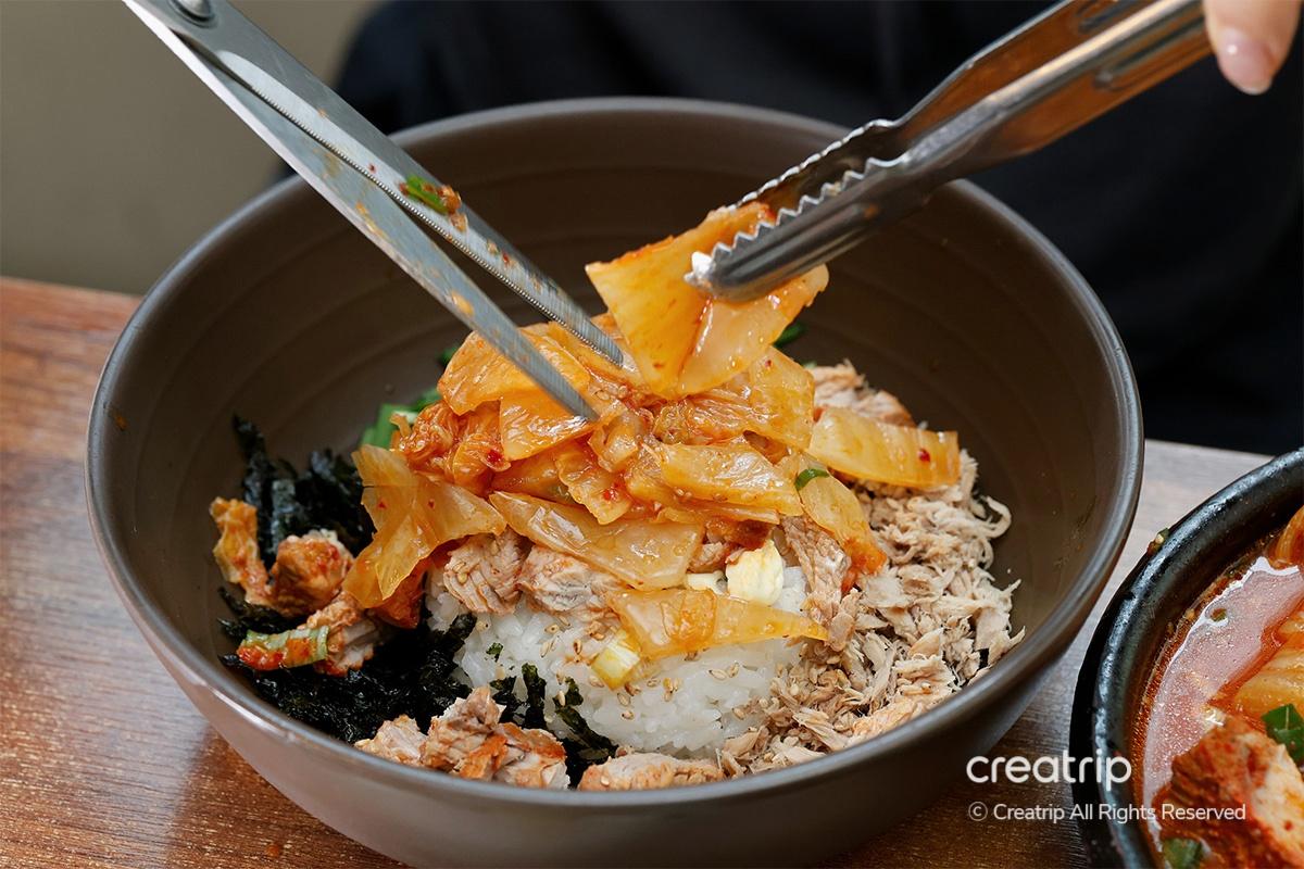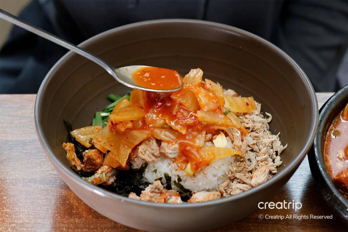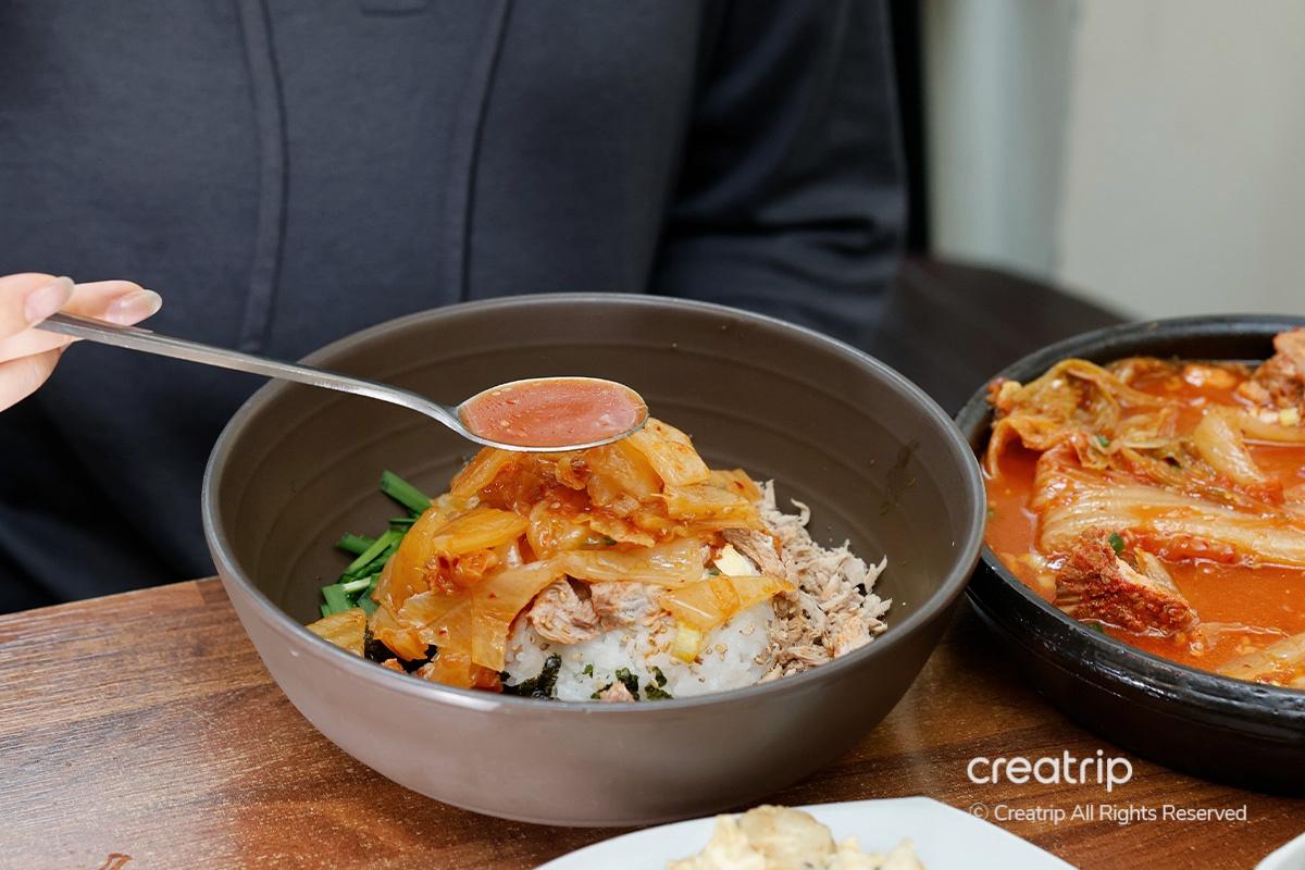 如果想要更完美的拌飯,在飯上面再加點燉辛奇的湯吧!