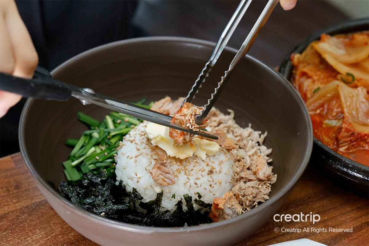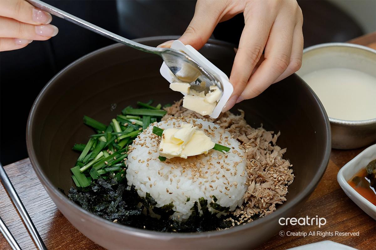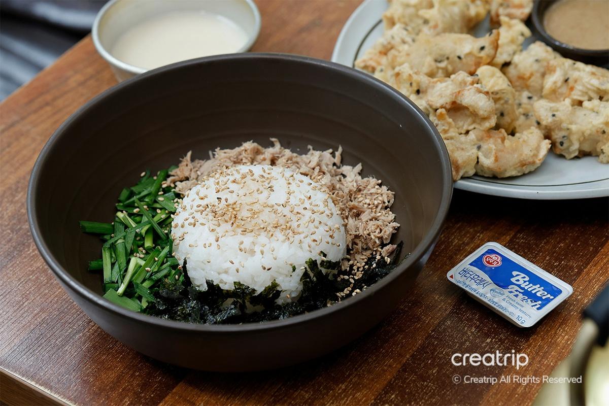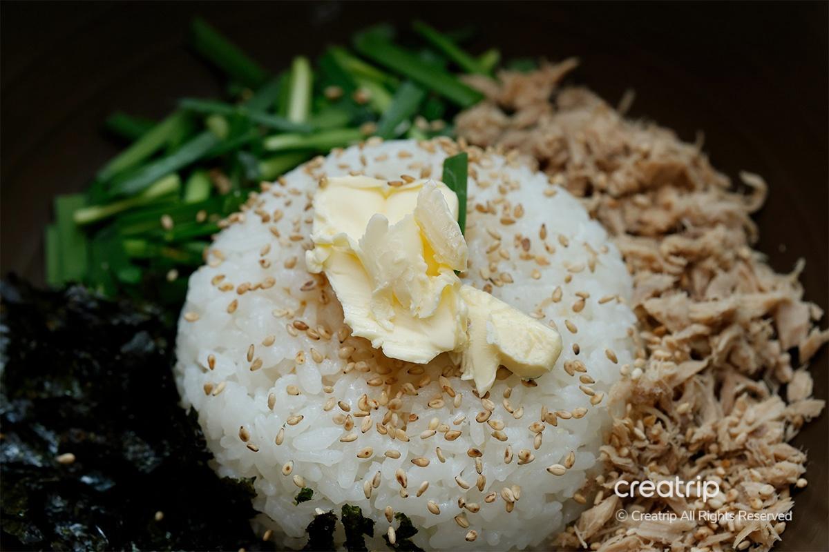 不是一般的米飯,而是添加了金槍魚、韭菜、紫菜粉、香油、黃油,可以完美組合拌着吃的菜品。