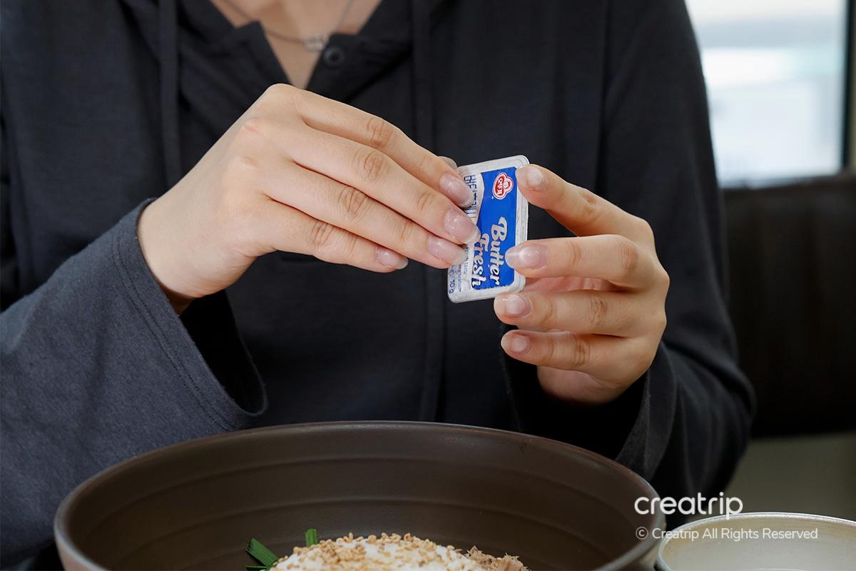 首先,先把一起提供的黃油放在熱飯上。
