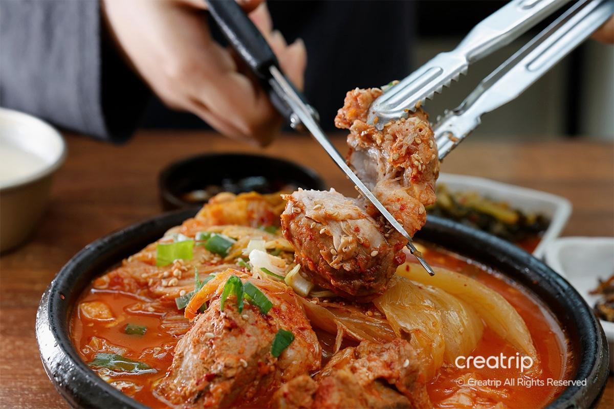 將柔軟的前腿肉和熟透的陳年辛奇一起蒸熟的燉辛奇,從上菜開始就以濃郁的香味刺激了食慾。