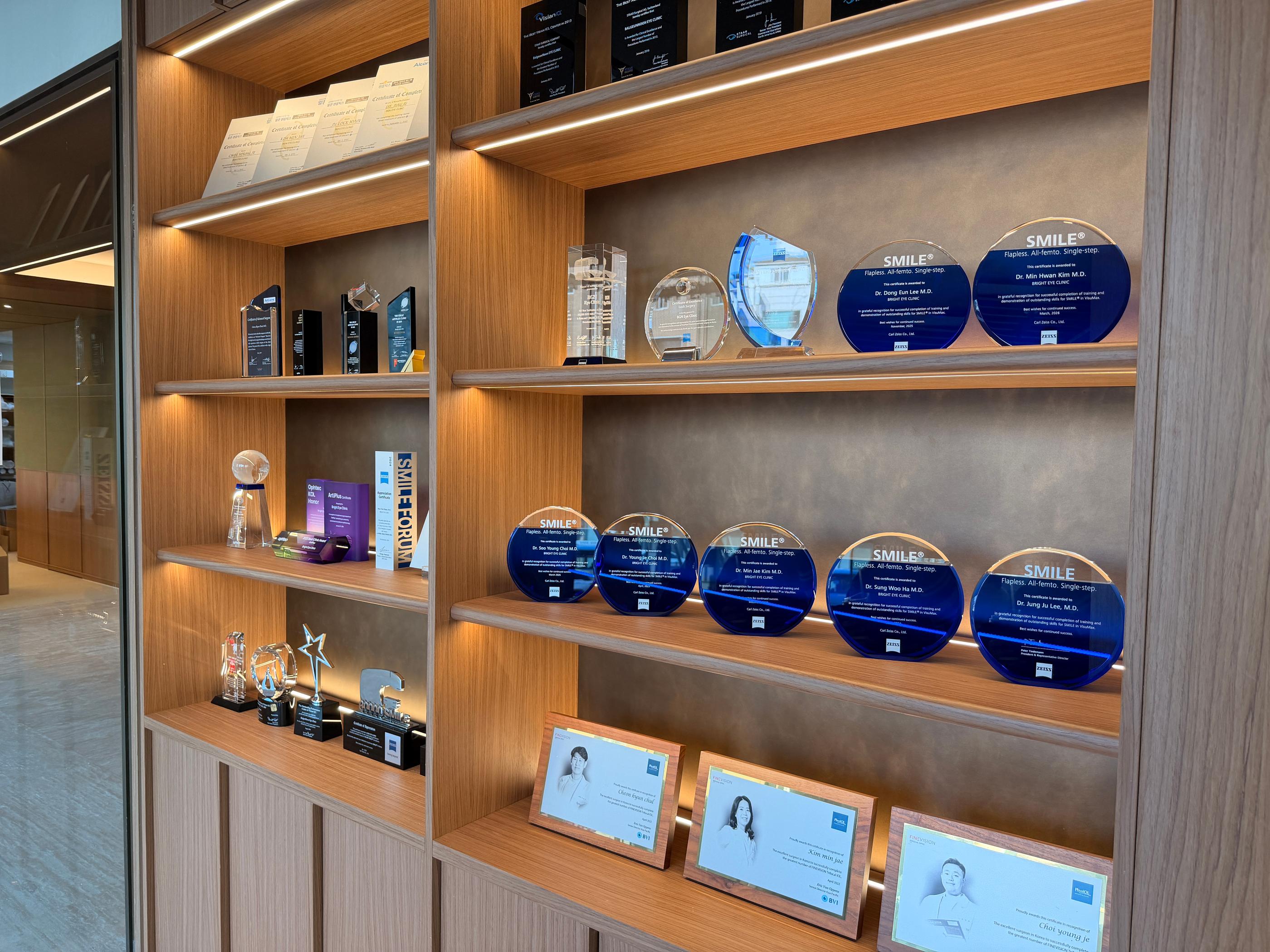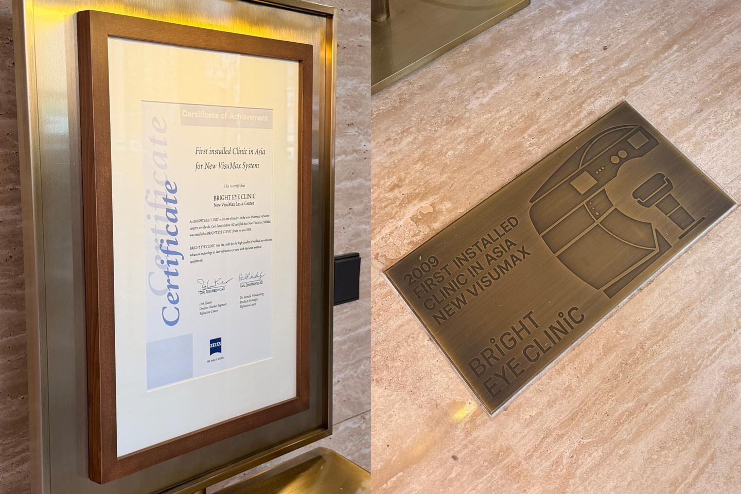 在進到診所前,目光就被門口的 「蔡司 (ZEISS) 亞洲首台VisuMax導入證書」 還有滿滿的獎牌、認證給吸引住了,現在全世界做全飛秒的診所很多,但明目眼科在2009年就作為亞洲先驅引進這台設備,光是這份始祖級的資歷,讓人還沒進到診所就已經先感受到那種走在技術尖端的紮實底氣,信任感瞬間拉滿!