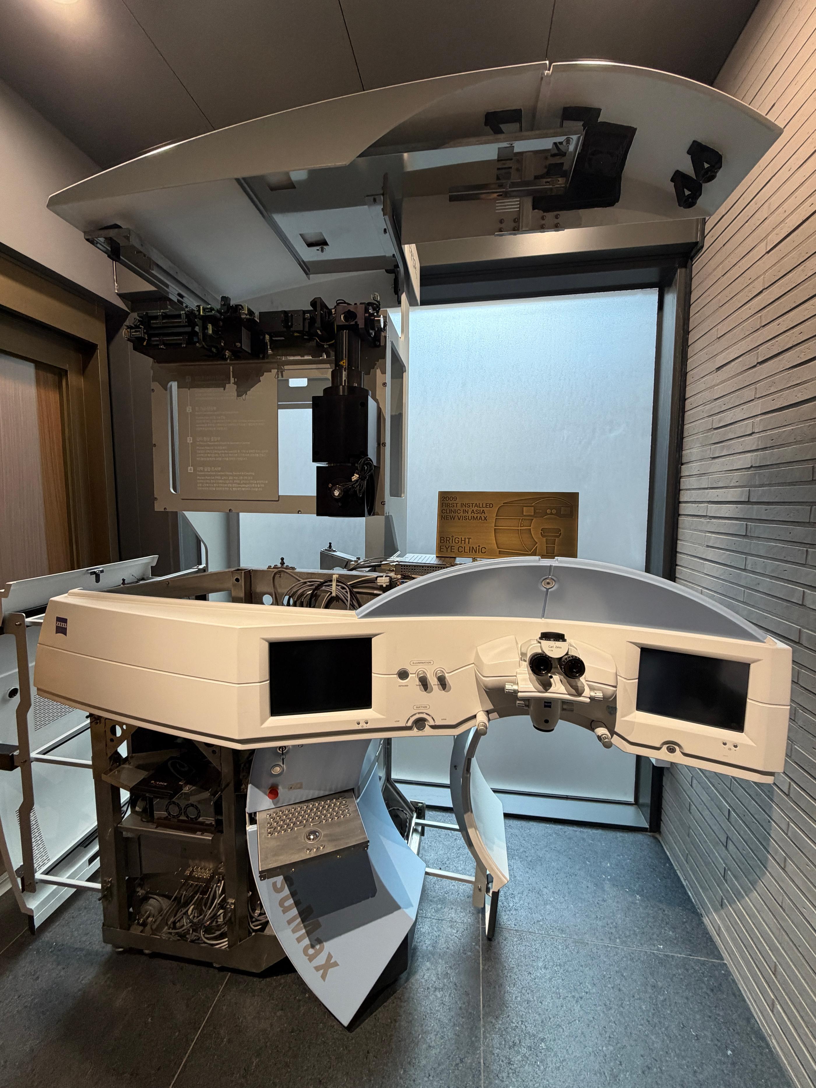 因為小編今天除了探訪空間之外,另一個私心目的是來做乾眼症治療,所以跳過部分檢查流程後就直接搭電扶梯前往地下一樓。才剛搭上手扶梯,入口展示的巨大的VisuMax全飛秒雷射機器直接讓我愣在原地拿出手機連拍,雖然在手術房也有短暫看過,但實際站在旁邊感受到的震撼真的很不一樣,聽說蔡司總部的人也對這台機器這樣的展示方式感到很驚訝。