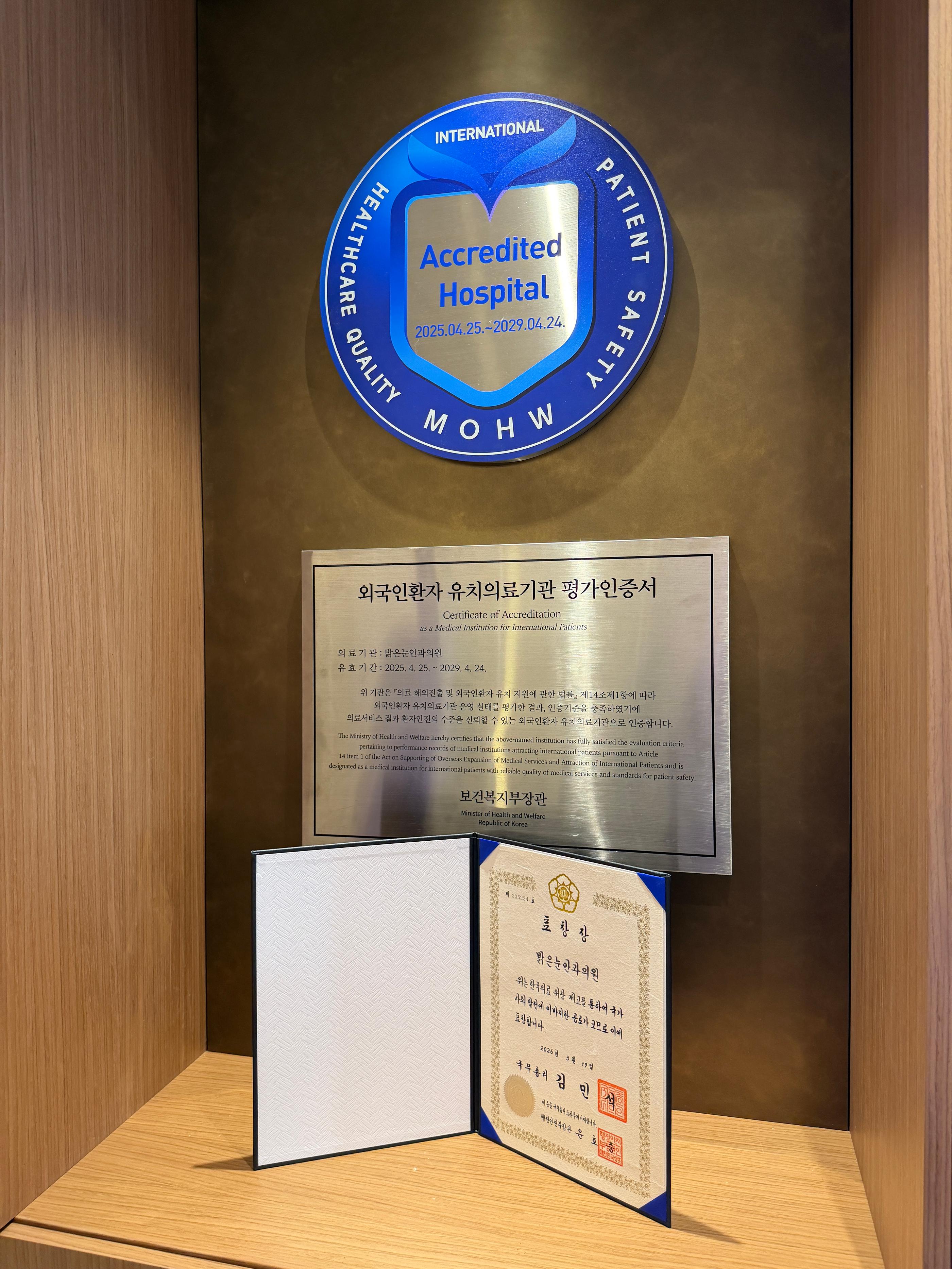 2026年韓國國務總理表彰獎:這是今年Medical Korea醫療功勞獎中,全韓國僅有3間醫院獲得的最高殊榮,明目眼科正是其中之一。去年到台灣說明會出差時,發現大家最常問的就是「安不安全、有沒有保障」,有這種「國家級認證」真的是最強的定心丸。在手術前坐在大廳看著這些證書,會讓人覺得把眼睛交給這裡非常放心。