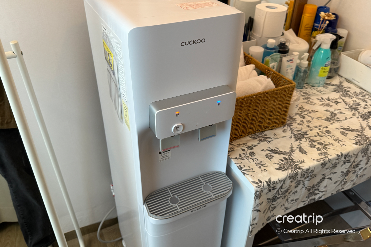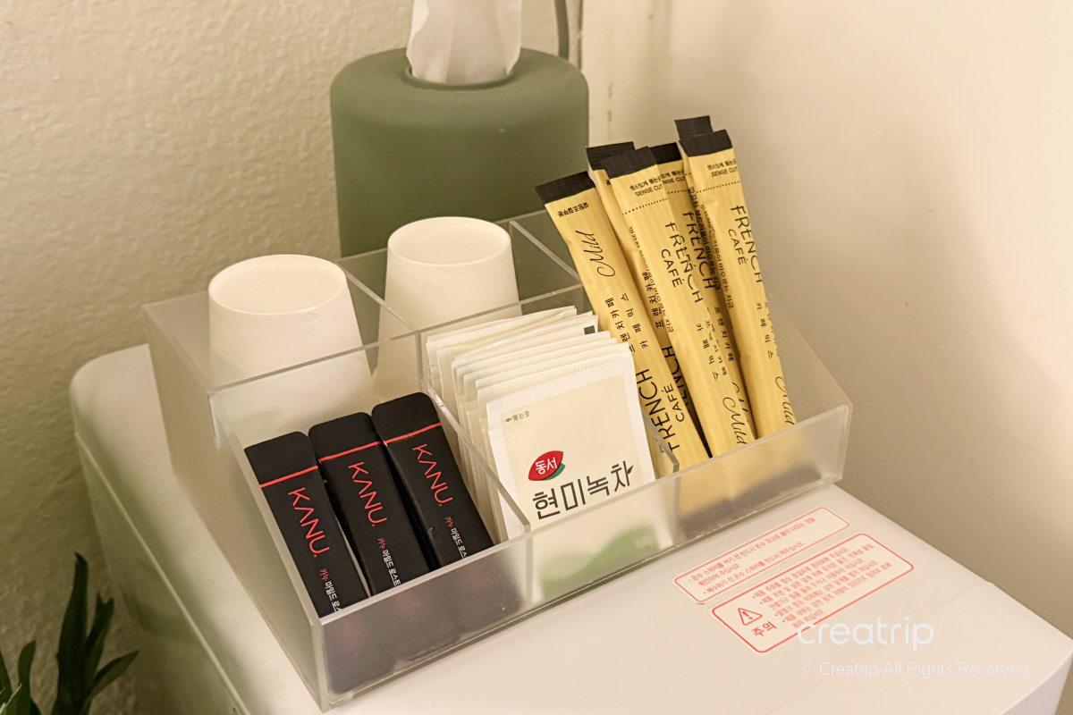 房內也備有淨水器,可以立即使用熱水和冷水,上方還準備了咖啡、茶包和紙杯,足夠讓人享用簡單飲品。