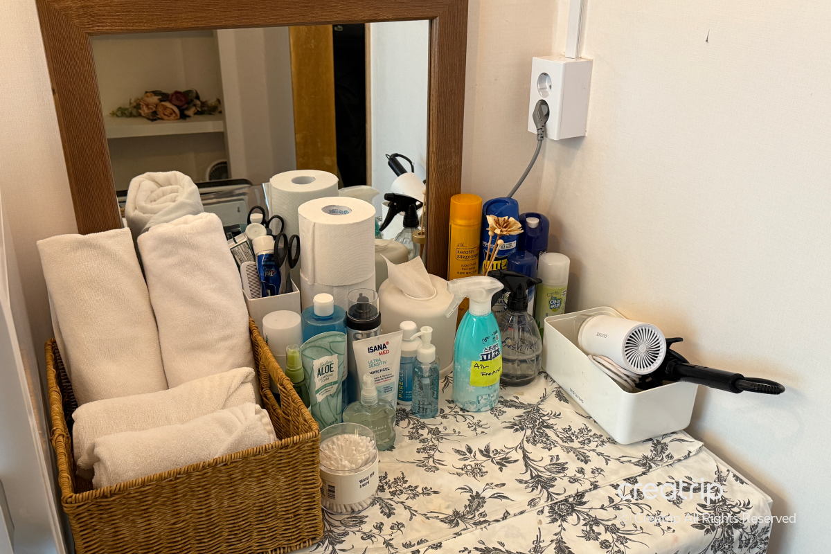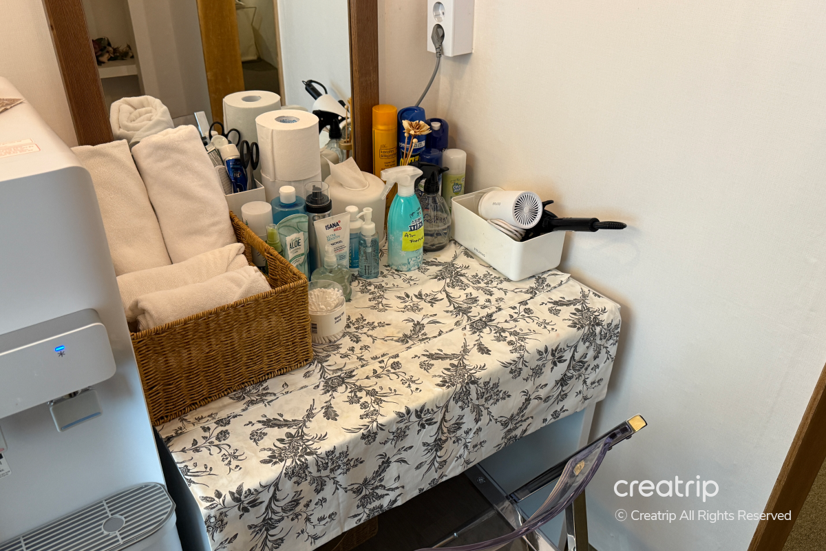 化妝臺上已準備各種用品,不用另外帶就能使用,如果使用第一間共用浴室,也可以一同利用這個空間,感覺很不錯!