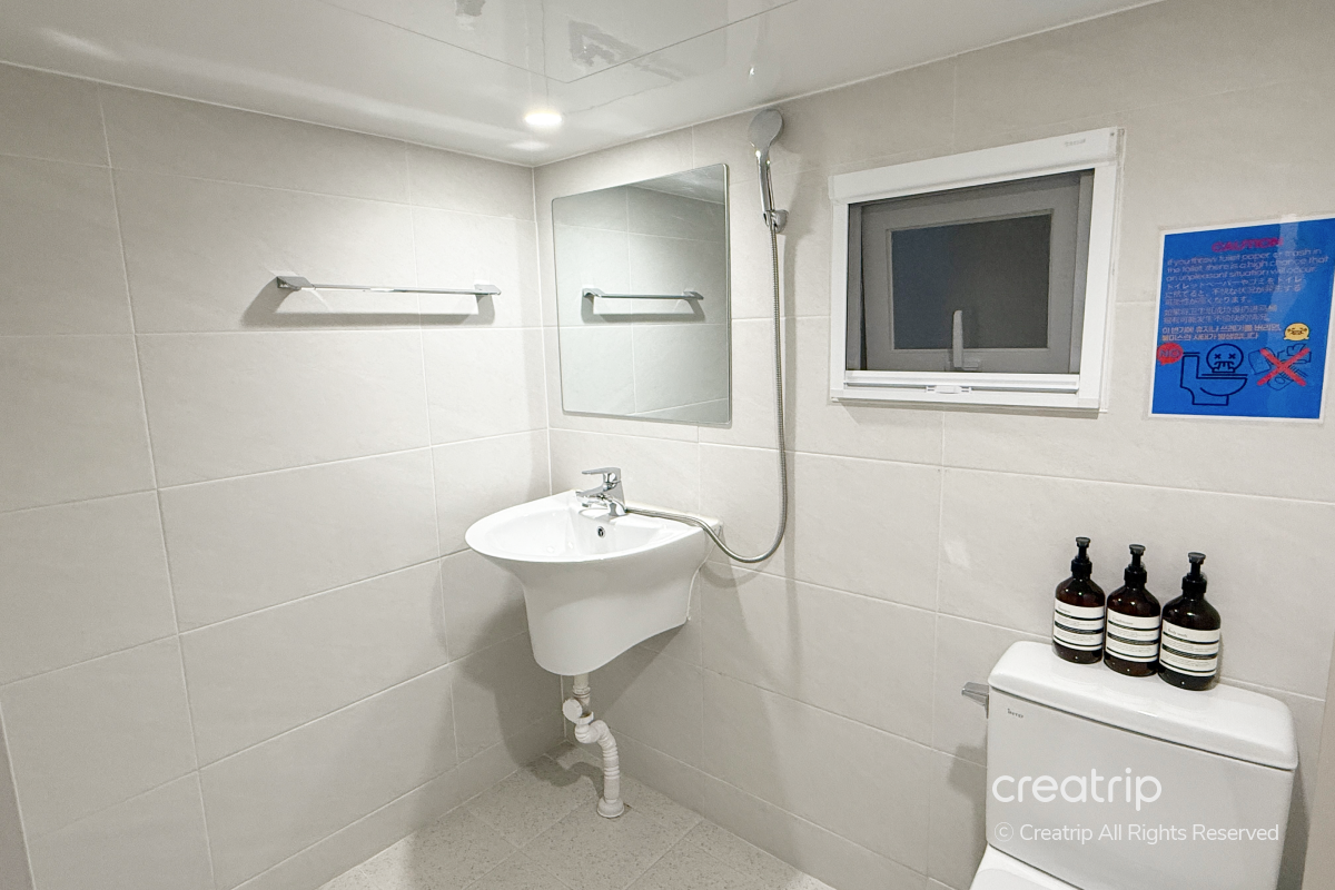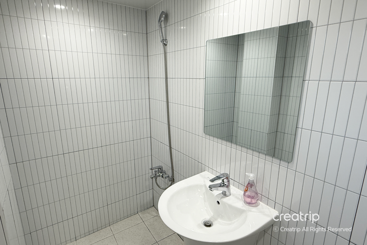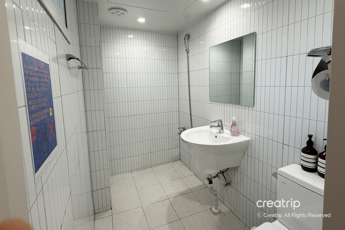 共用浴室空間不大,搭配柔和燈光,讓人能在舒適的氛圍下使用。