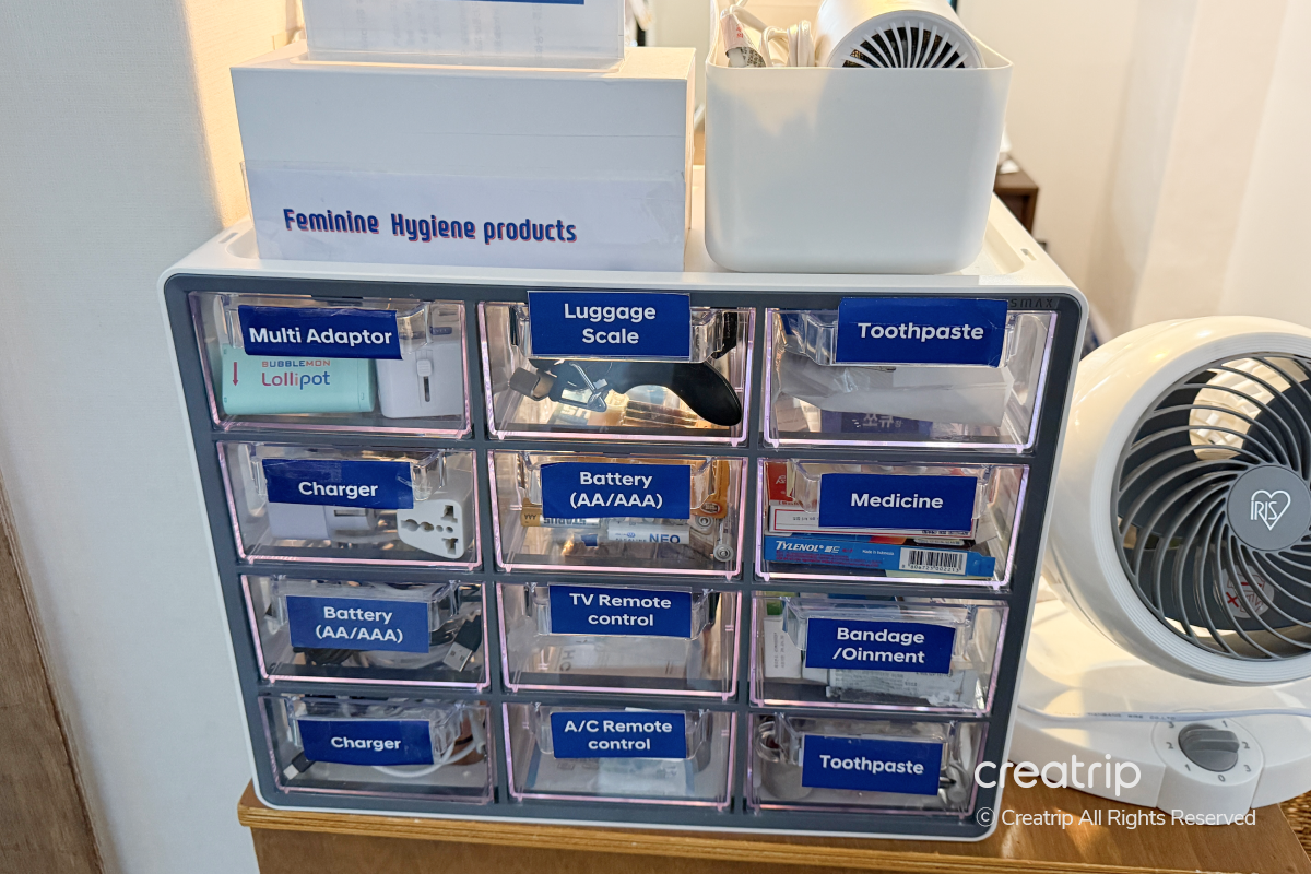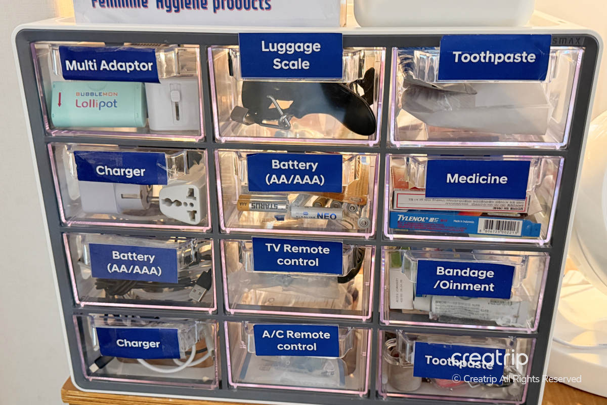 從多功能轉接頭、充電器、電池、旅行用行李秤等電子用品,到牙膏、肥皂等基本盥洗用品都準備得很齊全,還有備用藥品、OK繃和藥膏等簡單急救用品,必要時可以立即取用。