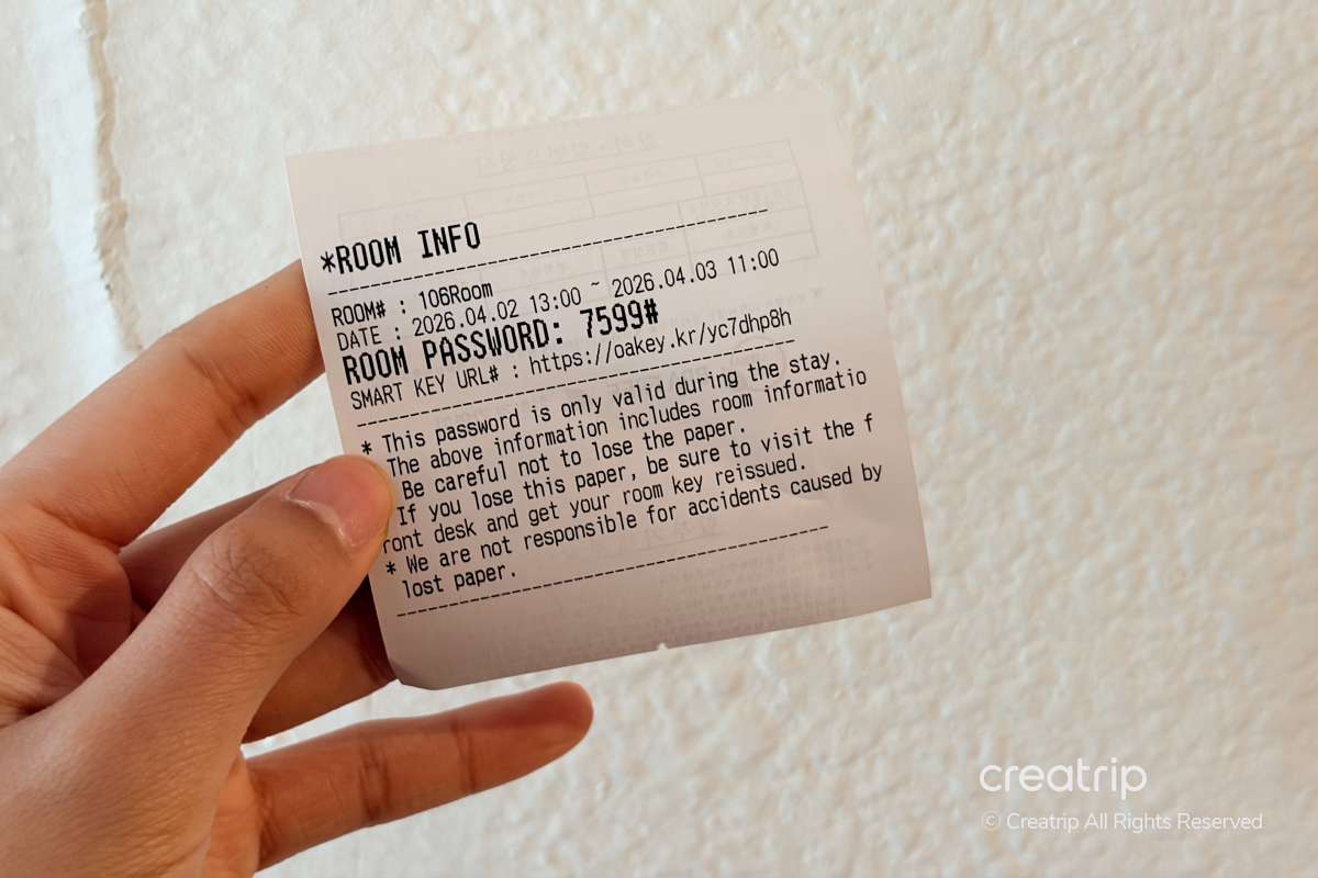 該收據上有註明房號和進出所需的密碼,因此不用實體卡就能直接使用。