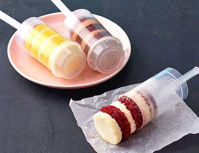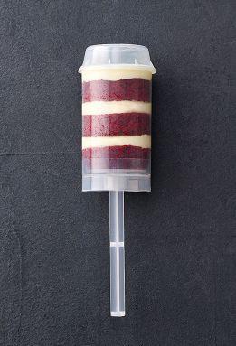 分別是黃色的檸檬口味蛋糕,咖啡色的巧克力口味蛋糕,以及深紅色的紅絲絨口味蛋糕