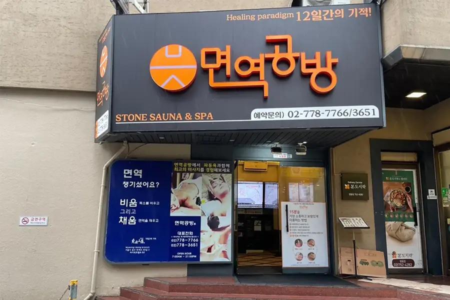 位於明洞商圈的「免疫工房」,提供一般汗蒸幕沒有的「熱石浴(岩盤浴)」,這裡以快速休息、療癒為重點,藉由熱石的震波讓毒素從體內排出,安定身心,是明洞購物後的放鬆首選。