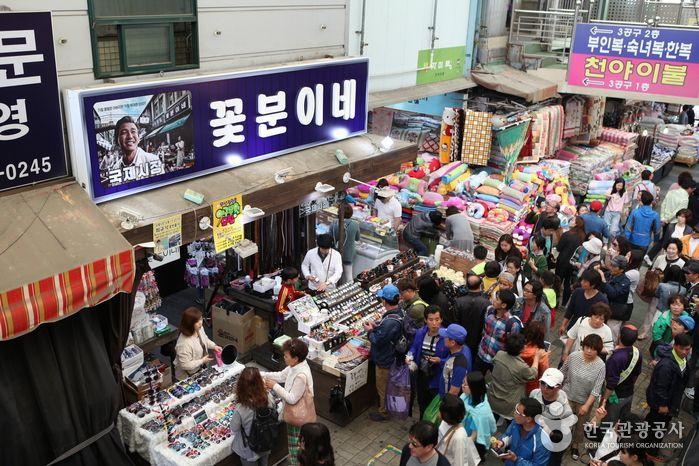 什麼都有的釜山傳統市場〈國際市場〉!國際市場裡面有小吃街、化妝品街、飾品街等各式各樣的街道。另外,也可以看到很多旅客搶著在電影拍攝地之一的花粉之家前面拍照呢!